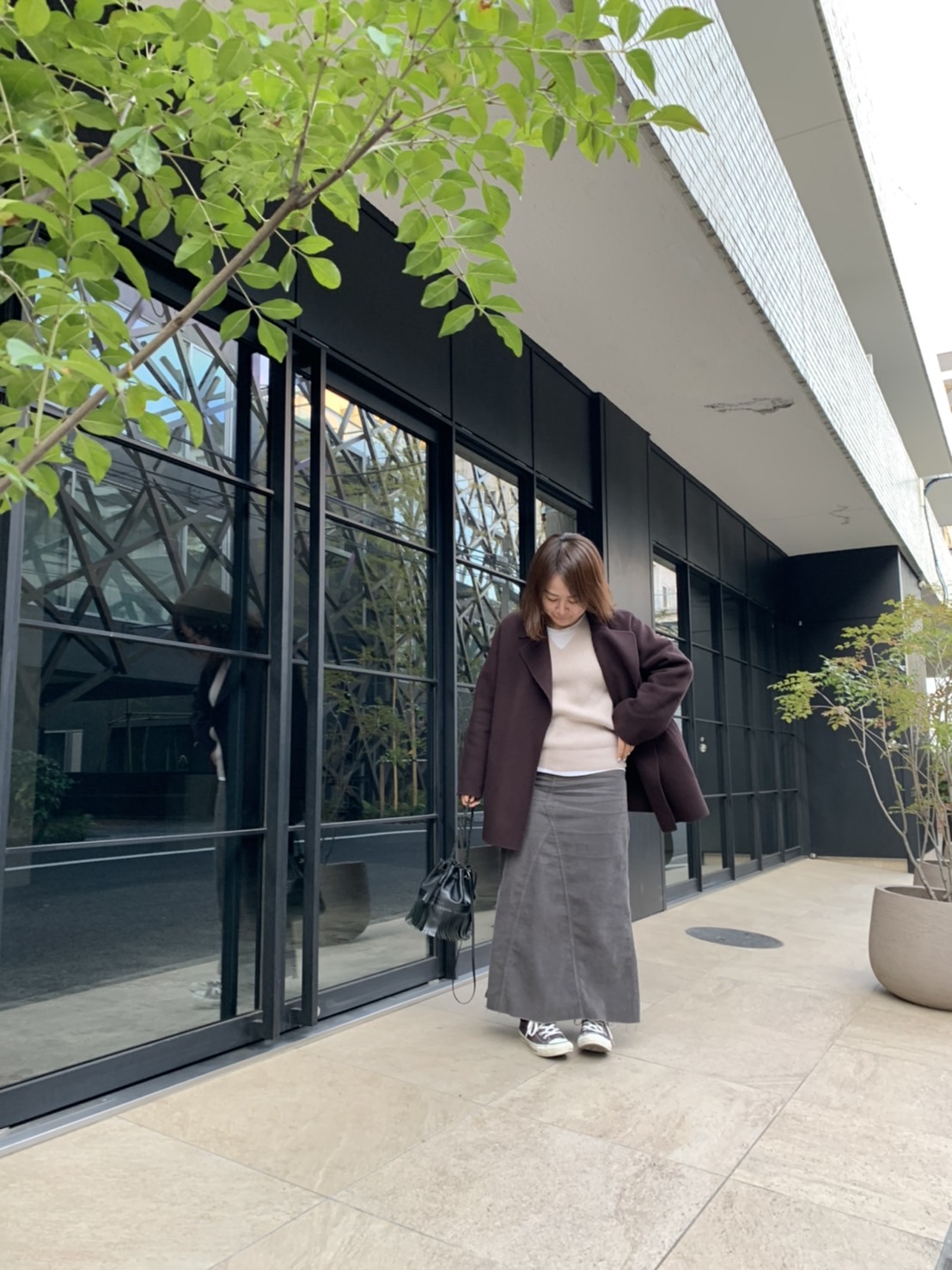 「数年前に買ったリバーコートは、とにかく軽くて暖かい!毎年大活躍しています。肩から袖のラインもゆったりしているので、集めのニットを着ている日もストレスフリー!動きやすいので冬のロケの日はよく着ているかも。年中ロングスカート派なので、お尻が隠れるハーフ丈という点もお気に入り。赤みのあるブラウンも合わせやすくて、インナーに何を着ても割となんでもいけます」(編集T)