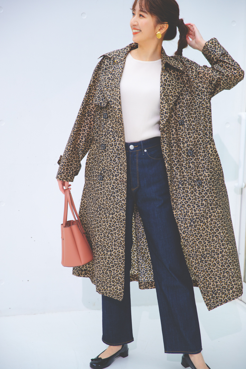 カジュアルに着るなら、軽やかなシャカシャカ素材&小ぶりの柄を選ぶのがベター。コートを主役に、デニムやバレエシューズでヘルシーさをプラスしましょう。コート¥118,000(マッキントッシュ/マッキントッシュ青山店)ニット¥36,000(ニット バー/アイネックス)パンツ¥22,000(ヤヌーク/カイタックインターナショナル)バッグ¥4,500(キャセリーニ)シューズ¥27,000(プロティ・バレリーナ/F.E.N.)イヤリング¥8,000(マージョリー・ベア/ココシュニック オンキッチュ 有楽町マルイ店)