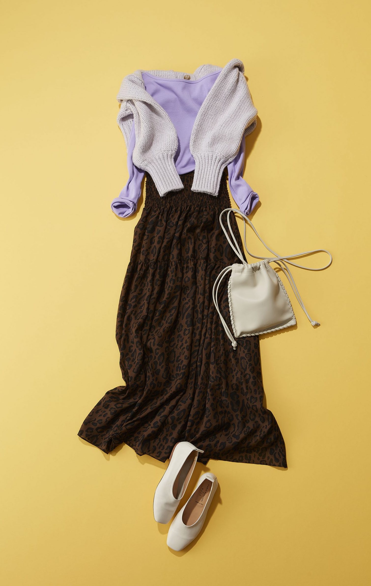 切り替えギャザーのレオパード柄スカートは、これひとつでスパイスたっぷり。ラベンダー色のカットソーやオフホワイトのざっくりニット&小物でフレッシュに着こなしたい。スカート¥21,000(ミューニック/ピーチ)カットソー¥11,000(ルミノア/ゲストリスト)カーディガン¥11,800(SNIDEL)バッグ¥28,000(VASIC/ヴァジックジャパン)シューズ¥21,000(ファビオ ルスコーニ & ウォッシュ/WASH ルミネ横浜店)