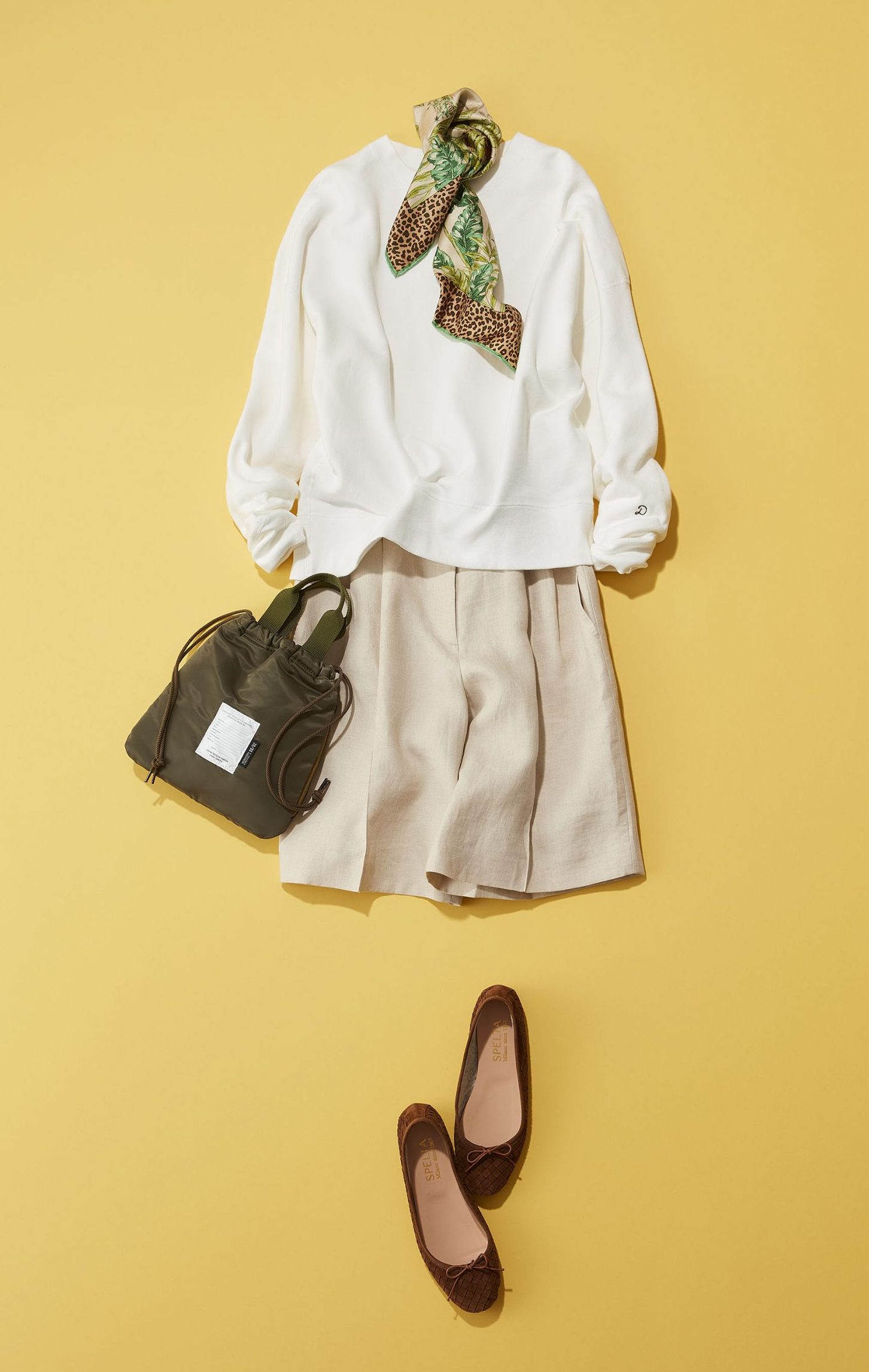 ありそうでない、柄MIXのシルクスカーフ。ベージュ×ブラウン×グリーンのスカーフと同系色で服をまとめると、爽やかさはきちんとキープできます。スカーフ¥12,000(マニプリ)スウェット¥13,000(ドレステリア/ドレステリア 新宿店)パンツ¥43,000(ebure/ebure GINZA SIX店)バッグ¥9,500(ジェーン スミス×トゥエンティー エイティー/UTS PR)シューズ¥28,000(スペルタ/フラッパーズ)