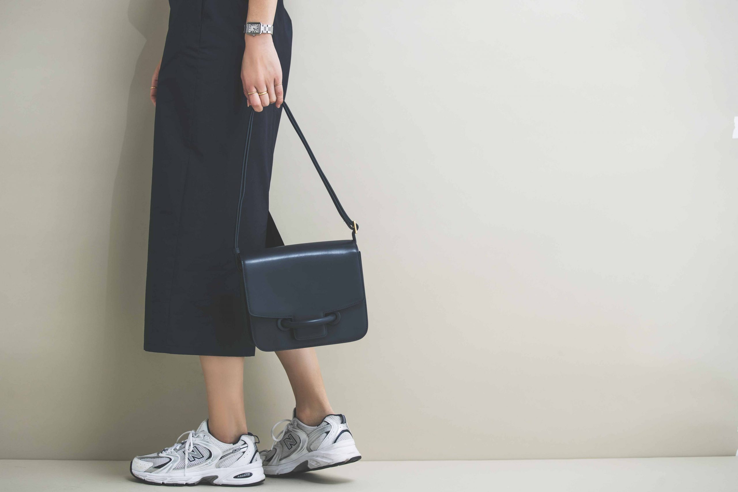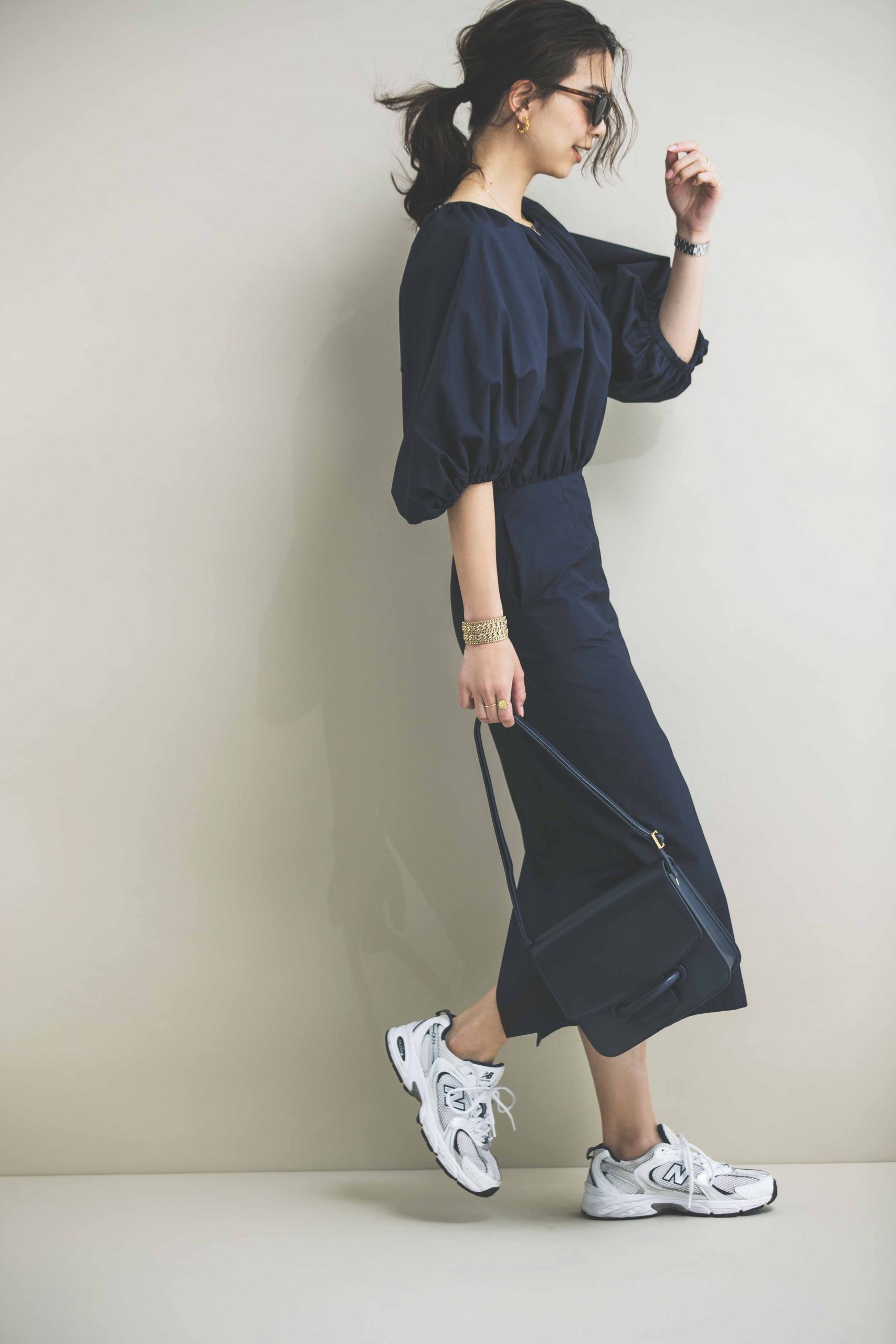 「バッグはワンピースの雰囲気に合わせたネイビーのレザーポシェットをコーディネート。このバッグ、小さく見えますが必要なものはしっかり入る実用感まで優秀です。足元は爽やかな白スニーカーで思い切りハズして。このニューバランス530は、ボリューム感とシンプルなカラーリングで見た目以上にスタイリングしやすいうえ、ランニングシューズならではのはき心地の良さです」