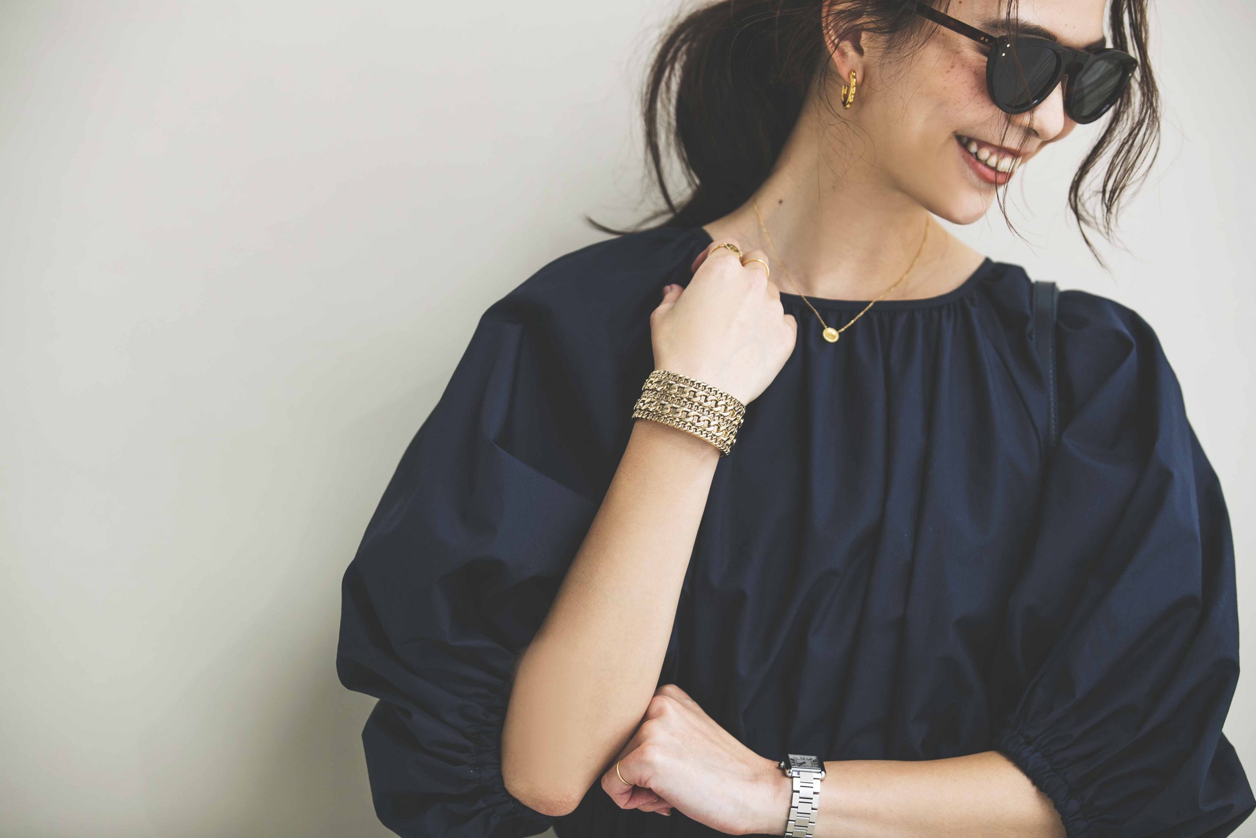 「バッグの金具がゴールドなのでアクセもゴールドで合わせました。ゴールドは女らしいエレガントな華やかさをプラスするのにぴったりです。デザインもメッシュ素材のゴールドやコインネックレスなど、地金ならではのなじみ感と華やかさを両立したデザインを選びました」