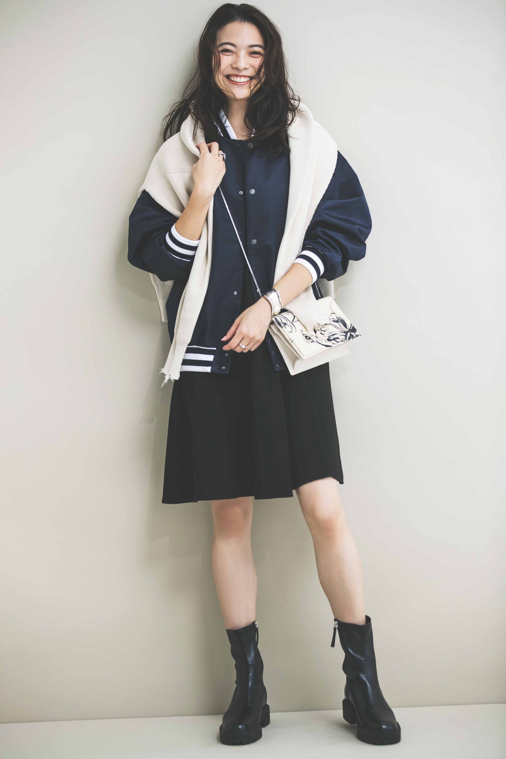 「黒ワンピはそのまま雰囲気に流されてヒールやポシェットでコンサバに着ると、古く見えてしまうので要注意! 夏はブラックミニワンピをさらりと着てシックなお出かけスタイルもいいのですが、春はブーツとブルゾンでカジュアル使いがポイントです。とにかくカジュアルアイテムをたくさん盛り込むのがオシャレで今っぽくなる秘訣。週末のお休みスタイルに良さそうですよね!」