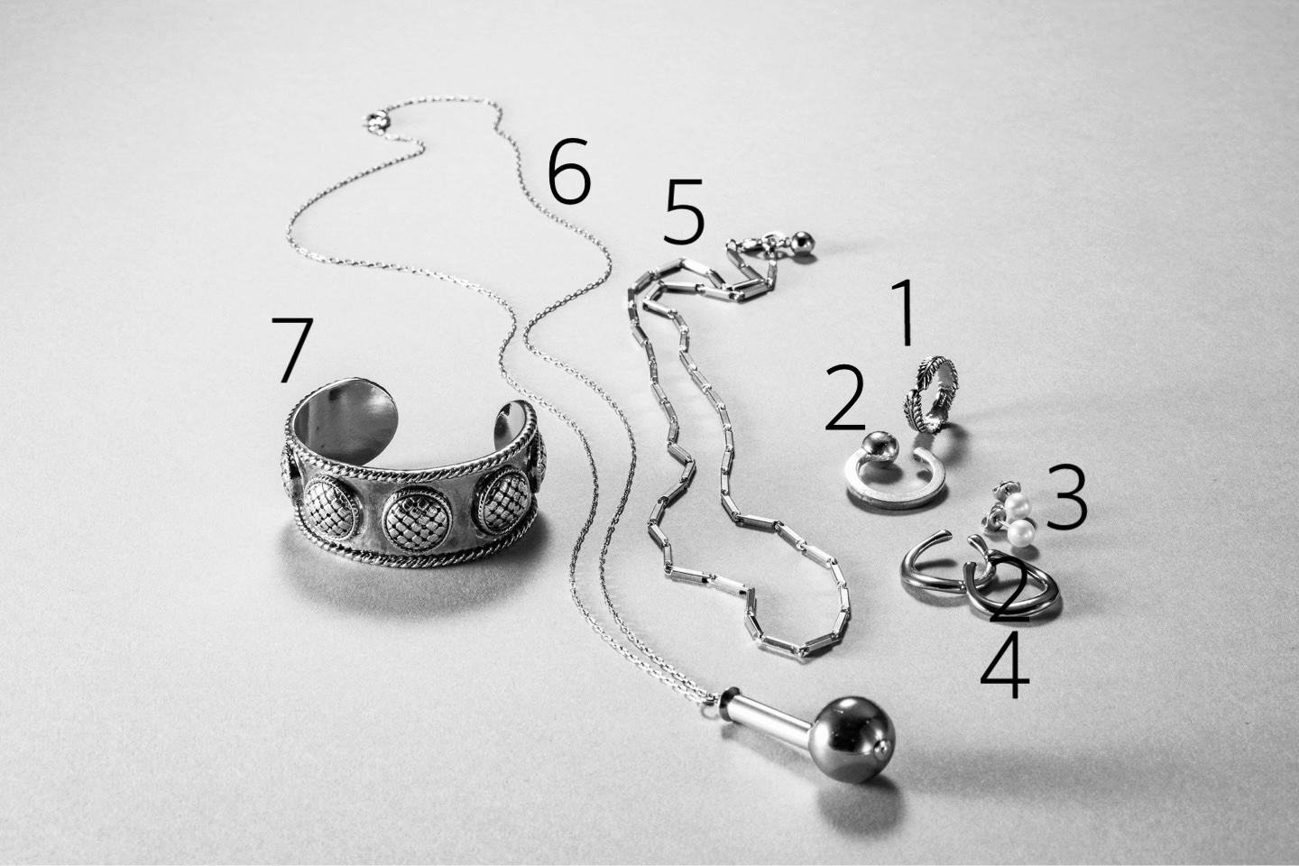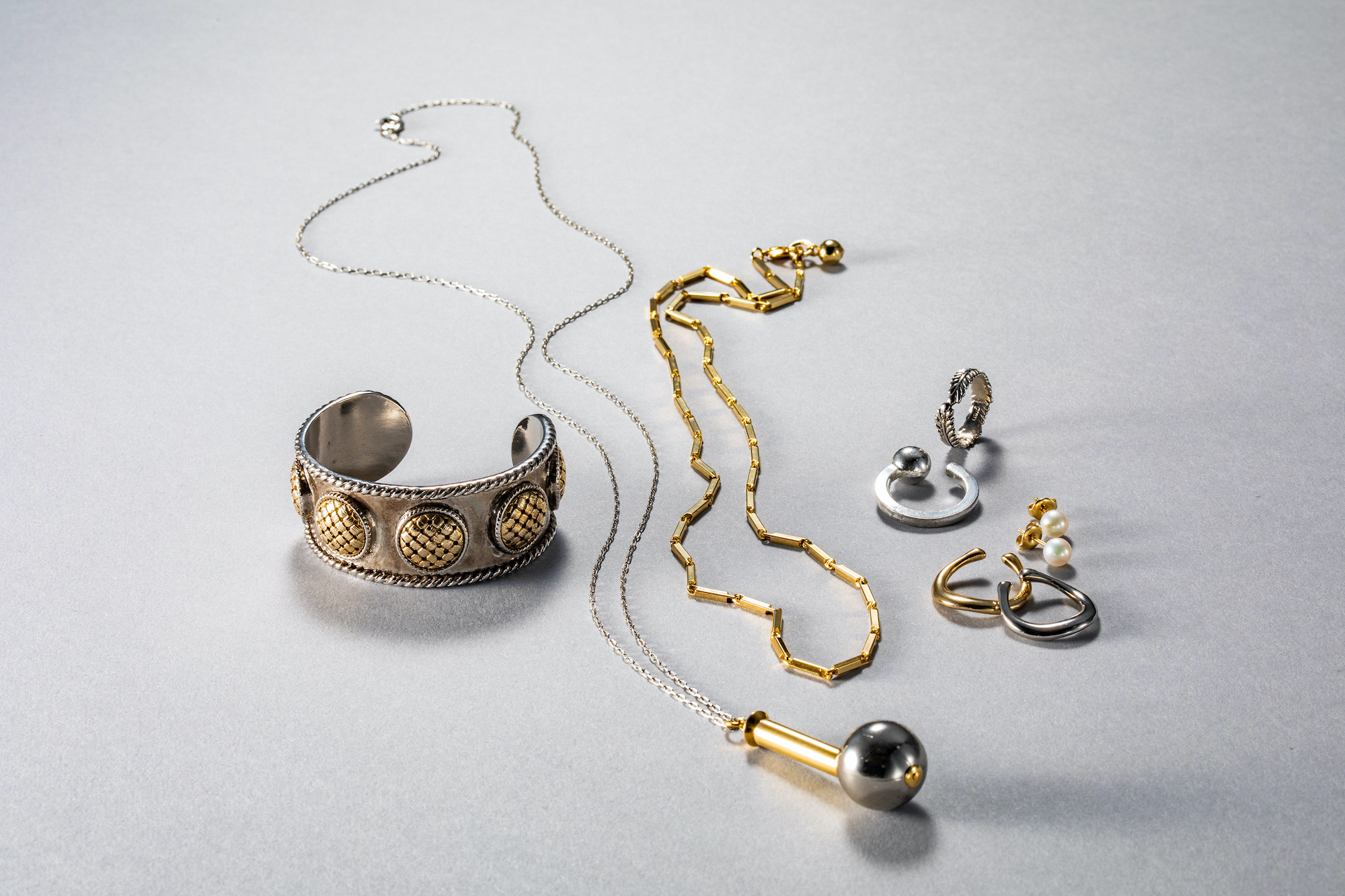 【1】フェザーのヴィンテージ感のあるデザインリングはグリンのもの。【2】シルバーでも登場したSea’ds Mara(シーズマーラー)のリングは、程よいシンプル&モードなデザインでミックスカラーをする時も大活躍。【3】ミックスカラーにパールも登場させて、上品さもプラス。パールピアスはミキモト。【4】gren(グリン)のイヤカフもゴールドとシルバーカラーの両方を組み合わせているのがポイント。【5】重ね付けしたチェーンネックレスは、gren(グリン)のもので直線的なデザインでモード感が高まります。【6】印象的なモチーフ使いでヴィンテージ&モードな雰囲気が楽しめるロングネックレスはgren(グリン)で購入したもの。【7】gren(グリン)のバングルはツヤのない燻しがきいたミックスカラーで、こなれ感が出せます。ゴツめのデザインもアクセントになってお気に入り。