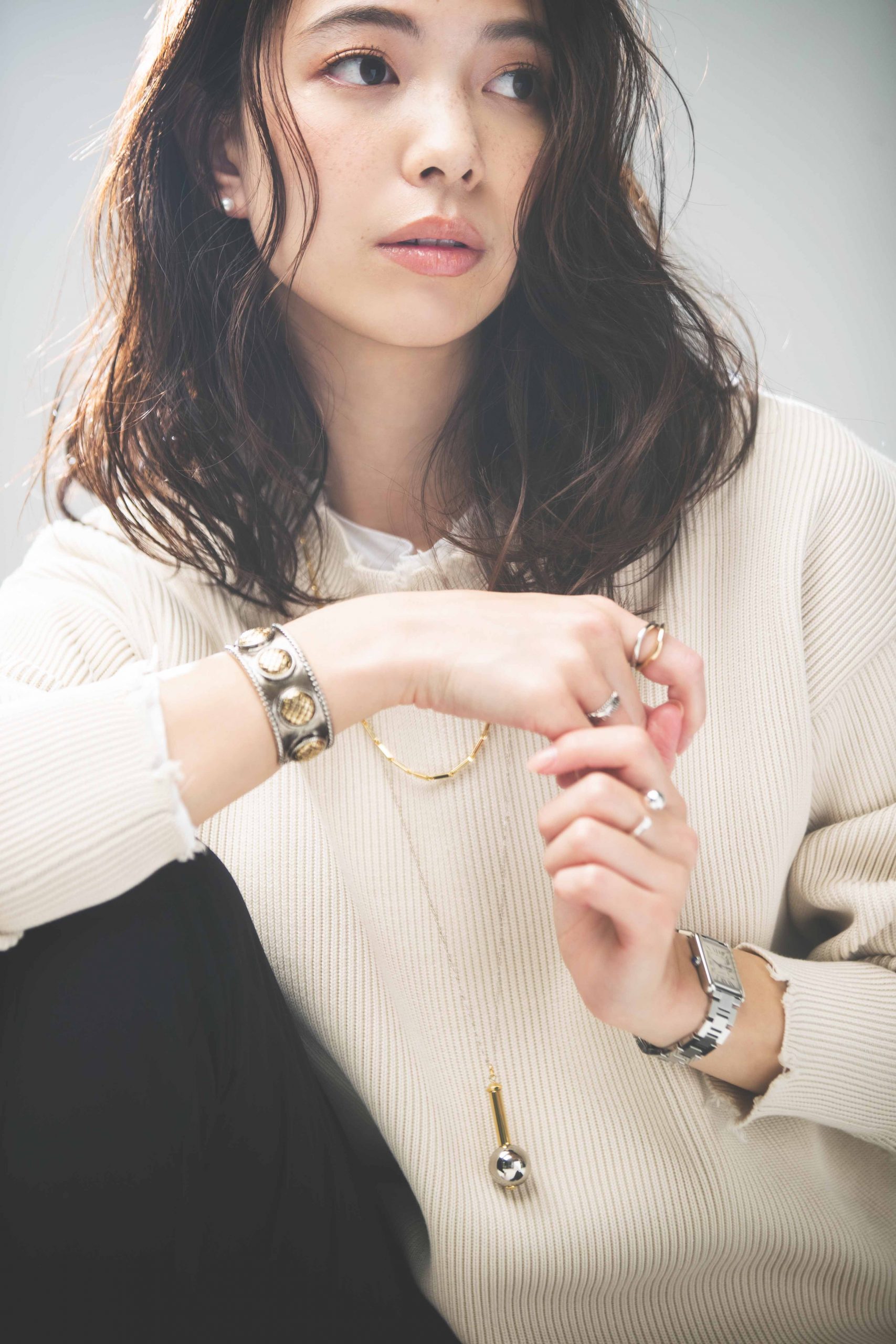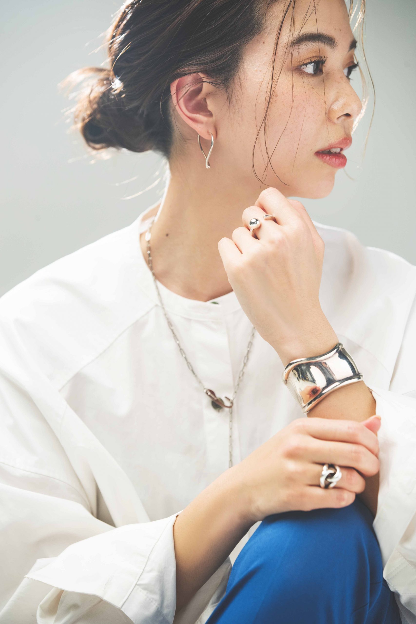 「今年のトレンドである首元が詰まったバンドカラーシャツは、きちんとさはそのままにシルバーアクセで程よいニュアンスをつけるのが気分です。“シルバー“というとメンズっぽかったり、ヴィンテージやインディアンアクセなどのカジュアルなデザインを選ぶ方法もありますが、私は断然”エレガントなシルバー派”。装飾のないプレーンでミニマムなデザインだったり曲線を活かしたフォルムのもの、細身のチェーンなど、女性らしいデザインを選ぶのがこだわりです。」
