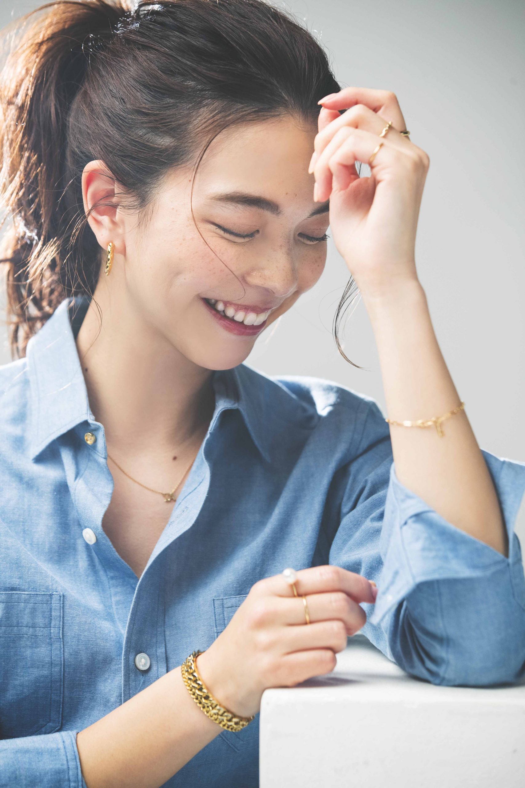 「デニムシャツというとシルバーを合わせる方も多いですが、実は女らしくて華やかなさのあるゴールドってデニムにもぴったりなんです。ポイントは華奢めなデザインかつ、メッシュやチェーンなど、素材感があるデザインを複数組み合わせること。モチーフやパールをワンポイント効かせてもうまくいきます」