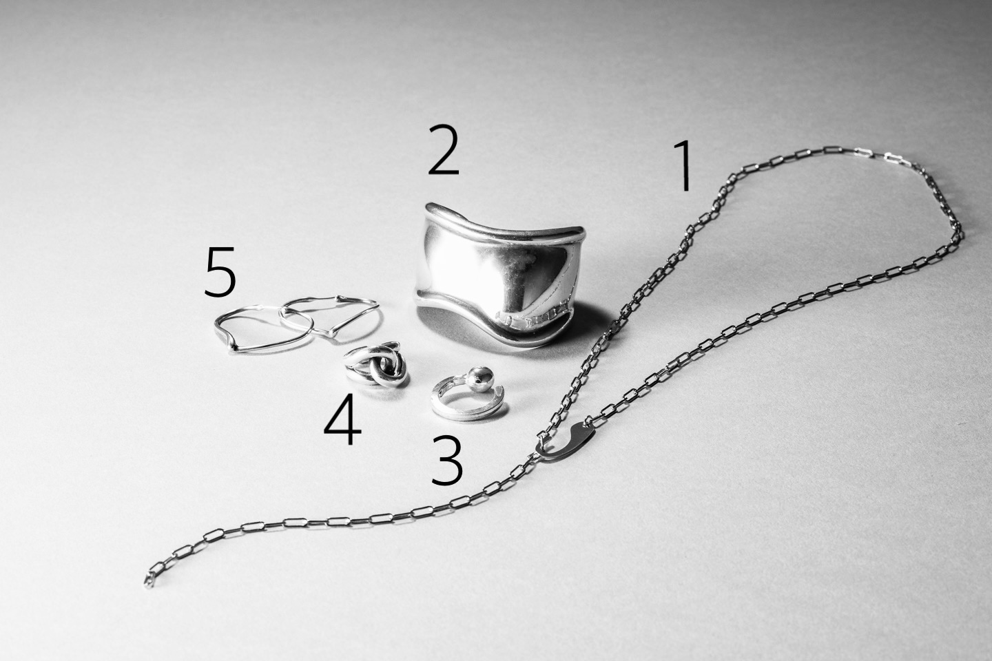 【1】使いやすい地金系のアクセサリーがそろうSea’ds Mara(シーズマーラー)の中でも、最近特に出番が多くなっているチェーンネックレス。繊細なスクエアチェーンをフックで好きな長さで調整できて、Y字に付けられるデザインがお気に入り。【2】長年使っているティファニーの名品ボーンカフ。ボリュームがあってゴツ目なので曲線使いでエレガントという、相反する要素を併せ持ったほかにはない唯一無二のバングル。【3】地金に施されたボールデザインが控えめなアクセントになるSea’ds Mara(シーズマーラー)のリング。【4】NYのヴィンテージショップで見つけたリングも曲線を組み合わせたデザインが手元を女性らしく演出。【5】こちらは最近、思い立って購入したティファニーのピアス。ティファニーらしい曲線と細身のシェイプがエレガントで、実はさりげなくハートになっているのも可愛いらしい。