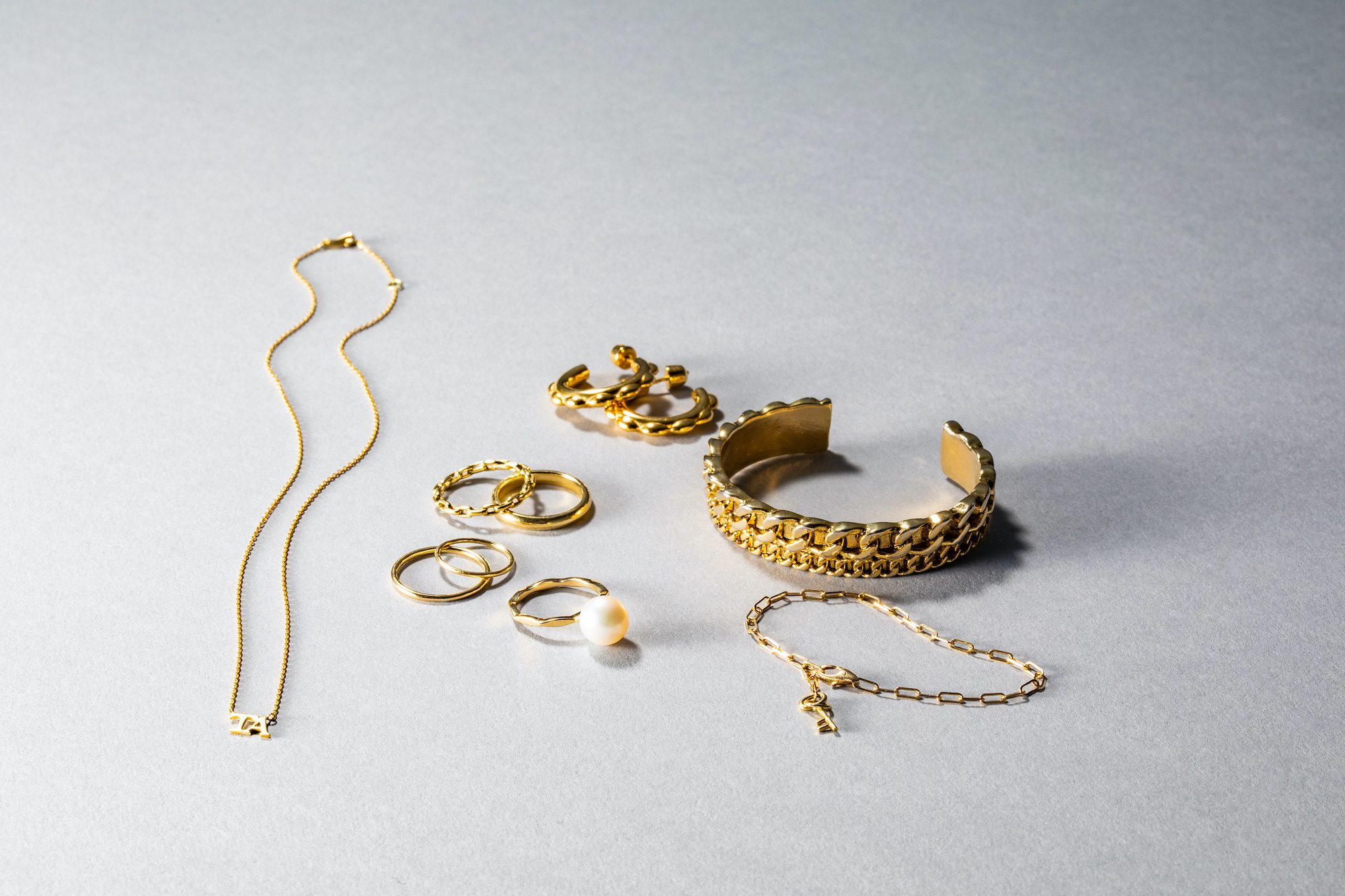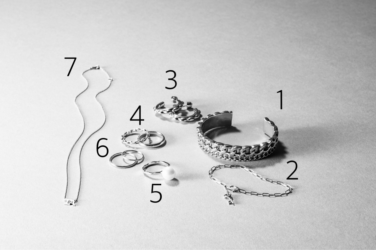 【1】gren(グリン)のカーブチェーンバングルは、喜平チェーンと細いチェーンを重ね付けしているようなデザインで、シンプルな服でも手元が寂しくなりません。【2】華奢で縦長の繊細なスクエアチェーンが手元になじんで控えめな華やかさが楽しめるGIGI(ジジ)のブレスレッド。【3】曲線が組み合わせされて柔らかな表情が出せるマリアブラックのピアス。【4】こちらはGIGI(ジジ)のリングでチェーンと地金のシンプルなデザインを組み合わせ。【5】地金のゴールド部分がさりげなくモード感のあるパールリングは、上質な国産アコヤパールを使ったモダンなジュエリーを展開しているOhara Pearl(オハラパール)のもの。【6】こういったシンプルな地金の細身リングをいくつも組み合わせるのがお気に入り。こちらもジジで見つけたもの。【7】イニシャルネックレスは、GIGI(ジジ)でオーダーしたもの。小ぶりのアルファベットチャームと細身のチェーンがポイント。