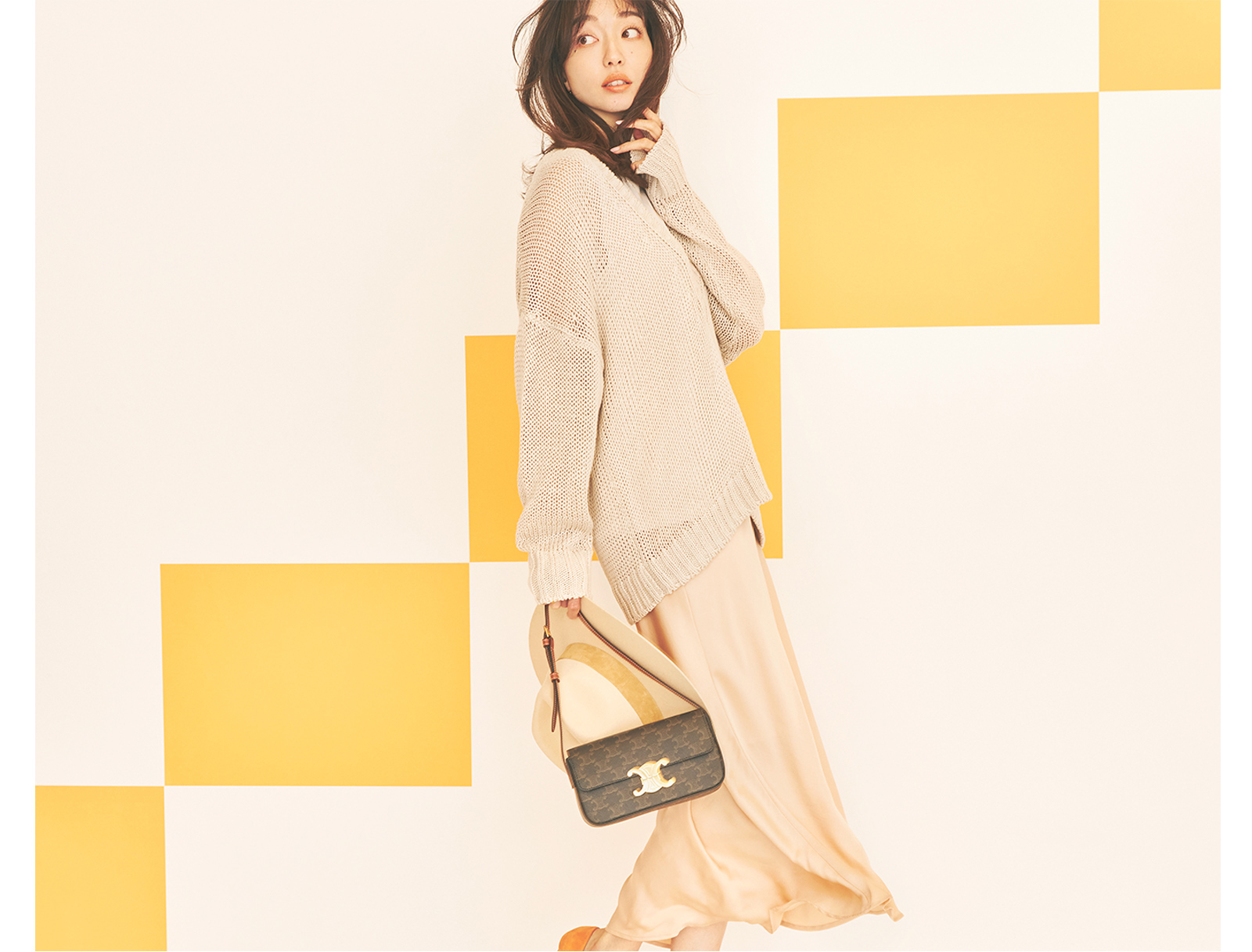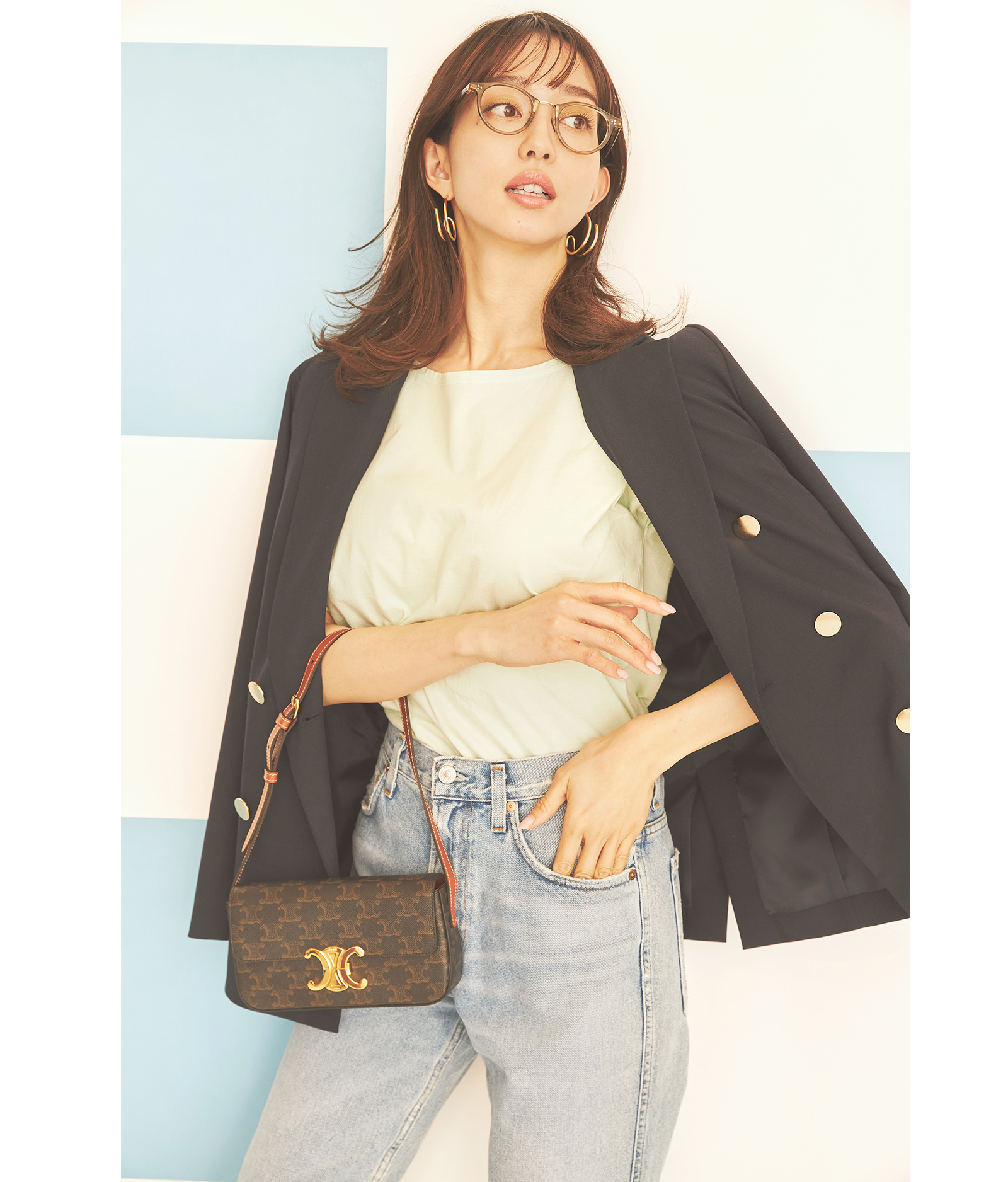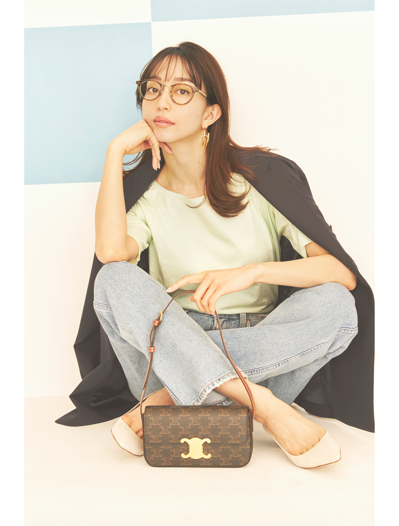 松島さんにとってセリーヌのバッグは「フォルムもサイズ感も使いやすいから、日常でも登場率が高め」な存在。スタイリングに欠かせないデニムにも合わせやすく、ぐっとリュクスな雰囲気に導いてくれる。「毎日デニムでもいいくらい、デニムが大好き。デニムやスニーカーのような普段のワードローブにフィットすることも、セリーヌのバッグの魅力です」