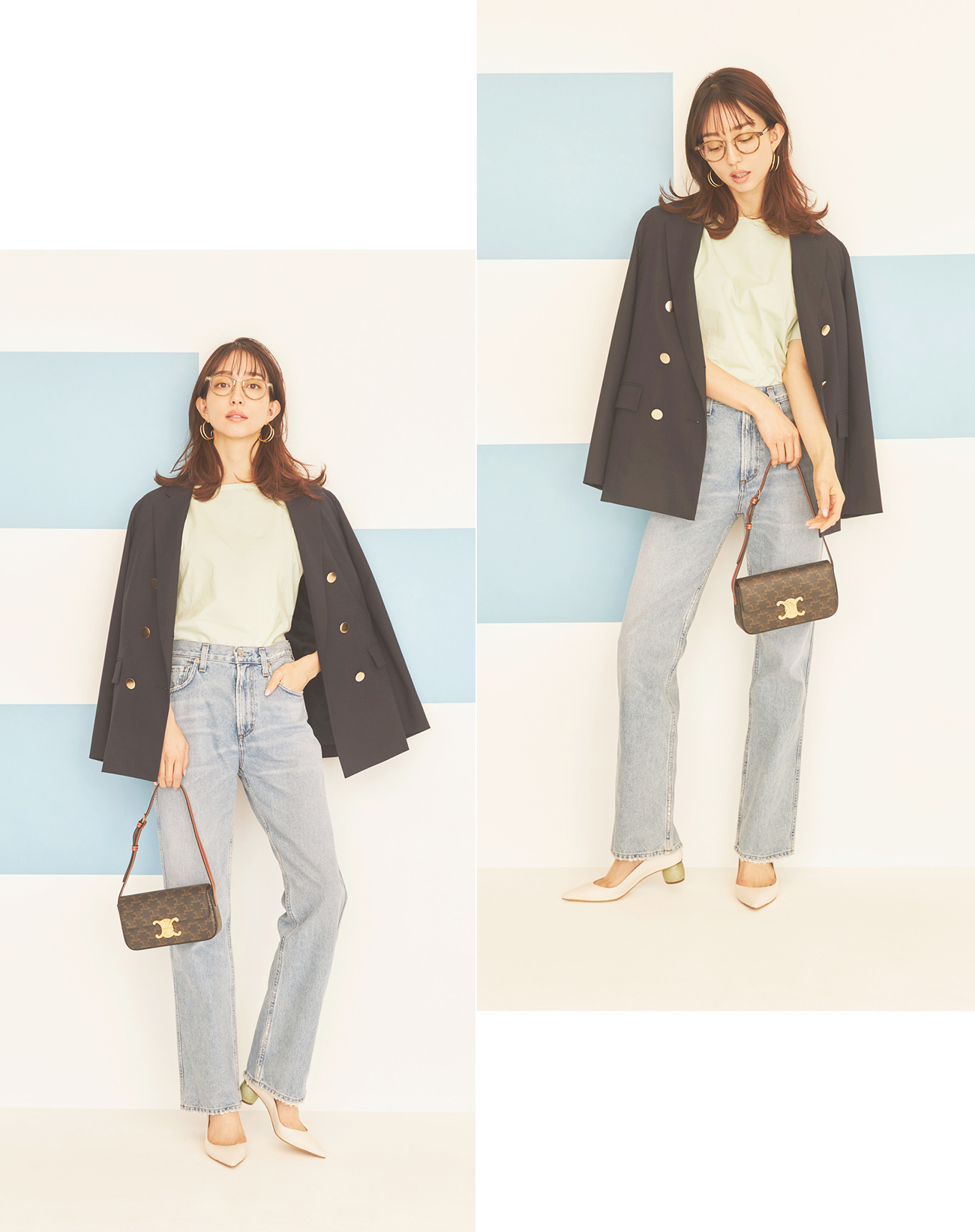 ジャケット¥16,000(ビーミング by ビームス/ビーミング ライフストア by ビームス アーバンドック ららぽーと豊洲店)Tシャツ¥13,000(GALERIE VIE/GALERIE VIE 丸の内店)ストレートデニム¥36,000(シチズンズ・オブ・ヒューマニティ)パンプス¥27,000(ファビオ ルスコーニ/ファビオ ルスコーニ ルミネ有楽町店)ピアス¥34,000(ブランイリス/エストネーション 六本木ヒルズ店)メガネ¥47,000(EYEVAN 7285/EYEVAN 7285 TOKYO)