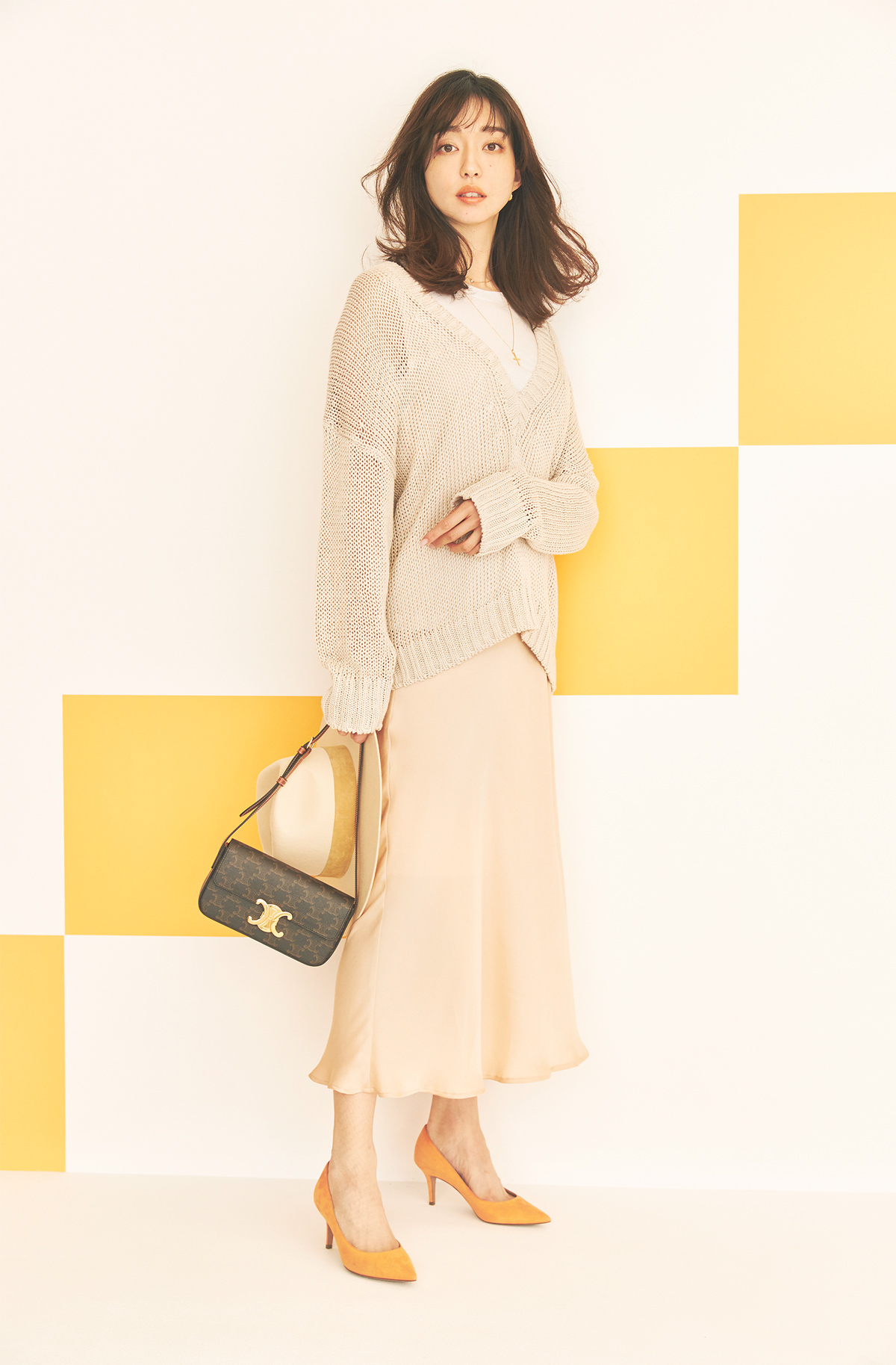 ブラウンが基調のシックなバッグは、ベージュ〜オレンジのグラデーション配色にもお似合い。リネンライクなニット×光沢スカートでゆるさのあるニュアンスカラーコーデの引き締め役にも一役買います。トリオンフが映えるデザインとボクシーなスクエアシルエットで、ほんのり甘さを感じる着こなしが大人リッチに。