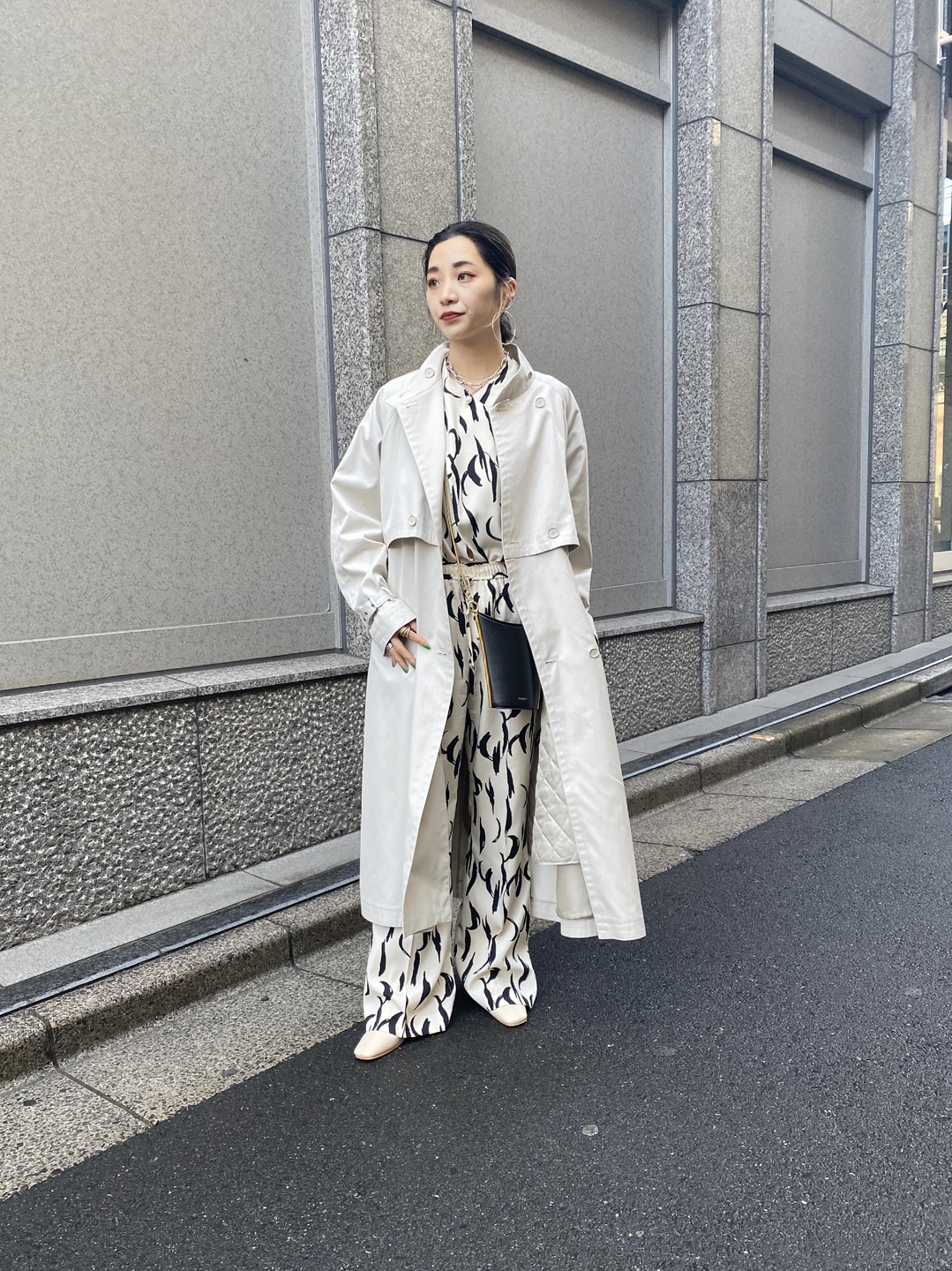 生地の分量が多いロングトレンチコートは、Sサイズの人だと着られてしまっている感じになりがちですが…「コートとインナーは同じトーンの色合いでまとめて、柄とバッグの色も黒で統一。そうすることで、すっきりとした印象に。トレンチ自体も、ヨークが高めの位置についているためウエストラインが高く見えてオススメです。小ぶりのバッグやまとめ髪×大きめピアスなどのあしらいも、スタイルアップ効果が狙えます」