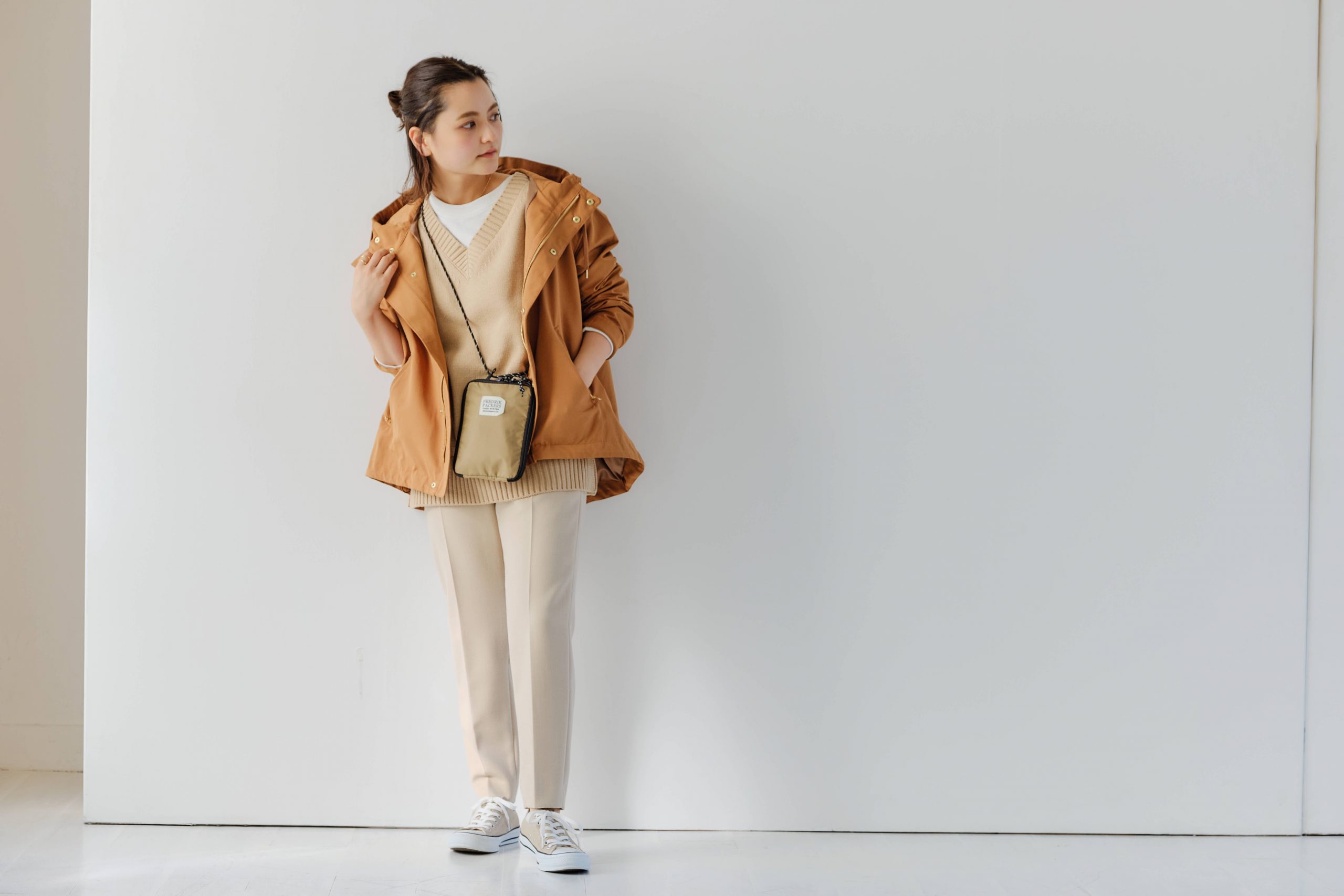 ダボッとしたマウンテンパーカも、ちょっとした工夫でスタイルアップ。「トレンドのゆるめマウンテンパーカは、衿を抜いて前後差を出すことでこなれた印象になるだけでなくウエスト位置も高く見せられます。ワントーンで揃えることで、大人っぽくすっきりとした着こなしにすることもポイント。小さめバッグを斜めがけするのもバランスよく収める秘訣です」UNITED ARROWS green label relaxingプレス藤野かりんさん(152cm)