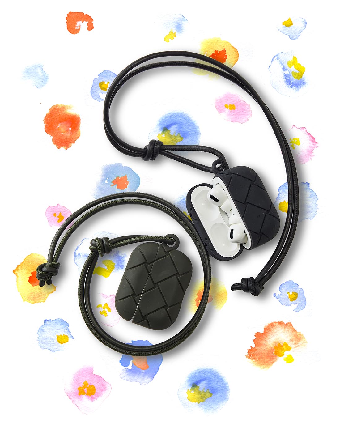 バッグの中で迷子になりやすいイヤホンをぶら下げれば、通勤時間がハッピーに♪ 大人気のレザーイントレチャートのAirPodsケースに、なんとラバー素材が仲間入り。1万円代という買いやすさとシリコンラバーケースならではの軽さがうれしい。黒、カーキ、イエローの全3色展開。AirPods Proケース各¥17,000(ともにボッテガ・ヴェネタ/ボッテガ・ヴェネタ ジャパン)
