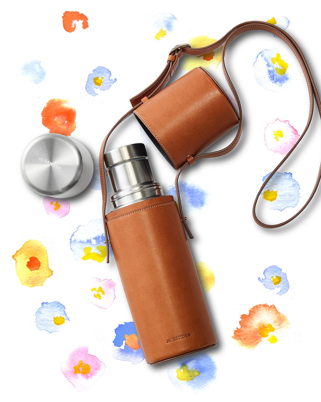 JIL SANDER+らしいクリーンなレザーのMYボトルにお気に入りのコーヒーを携える、そんなワンランク上の心地よい暮らしを! ベジタブルタンニンレザーのサーモスケースは、経年変化も楽しめるエコな逸品。肝心のボトルは米カリフォルニア州のクリーンカンティーンのもの。高い保冷・保温機能に加えて、飲み物の香りを残さない電解研磨された高品質ステンレス素材を使用。水筒¥115,000(ジル サンダー+ バイ ルーシー アンド ルーク・メイヤー/ジルサンダージャパン)