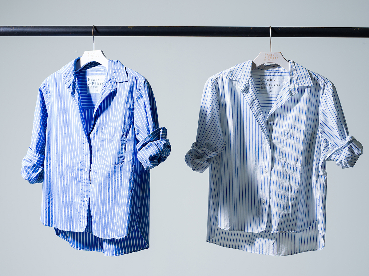[左]SILVIOブルーストライプシャツ¥30,000 [右]SILVIOホワイトストライプシャツ¥30,000(ともにフランク&アイリーン/サザビーリーグ)