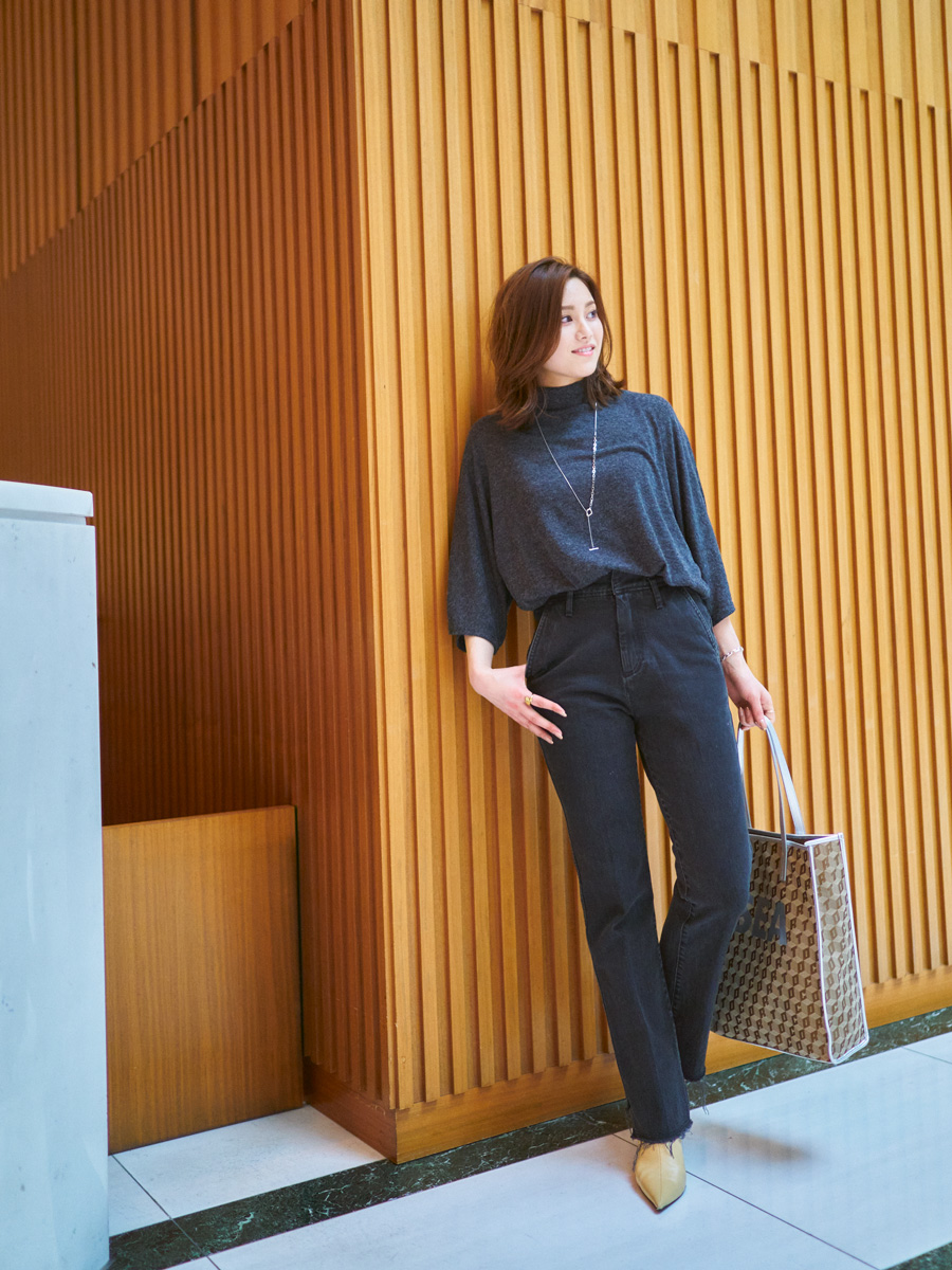 「脚長に見えるデニムのシルエットを際立たせたかったので、ベーシックカラーのワントーンコーデにしました。デニムが美シルエットならシンプルコーデもサマになります。手首を見せることで、ダークグレーの上下を軽やかに」