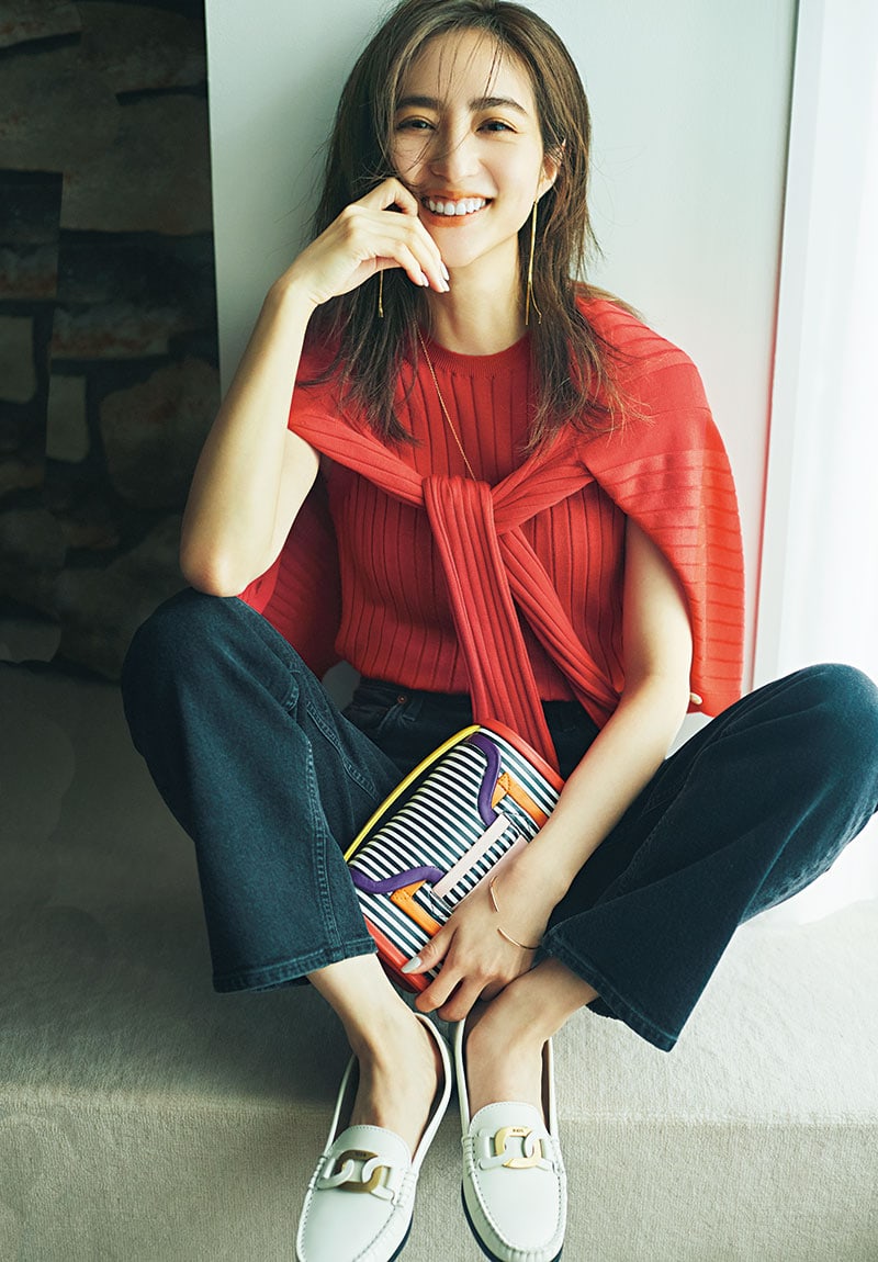 カーディガン¥32,000 ノースリーブニット¥26,000(ともにジョンスメドレー/リーミルズ エージェンシー)デニムスカート¥26,000(LE PHIL/LEPHIL NEWoMan新宿店)ピアス¥8,000〈ワンエーアールバイウノアエレ〉ブレスレット¥18,000〈ウノアエレシルバーコレクション〉(ともにウノアエレ ジャパン)パンプス¥54,000(ペリーコ/アマン)バッグ¥142,000(J&Mデヴィッドソン/J&Mデヴィッドソン青山店)