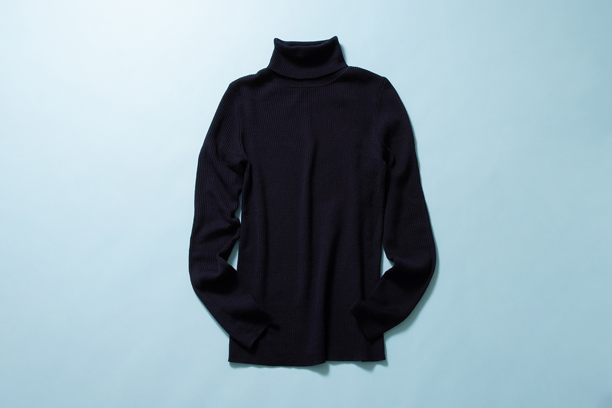 「ネイビーやブラックなど毎年濃いカラーを選んで買い替えているリブタートルネックニットは、細いリブが体にほどよくフィットして、ほっそりと見せてくれるのが高ポイント。キャミワンピやサロペットのインとして欠かせない存在です」