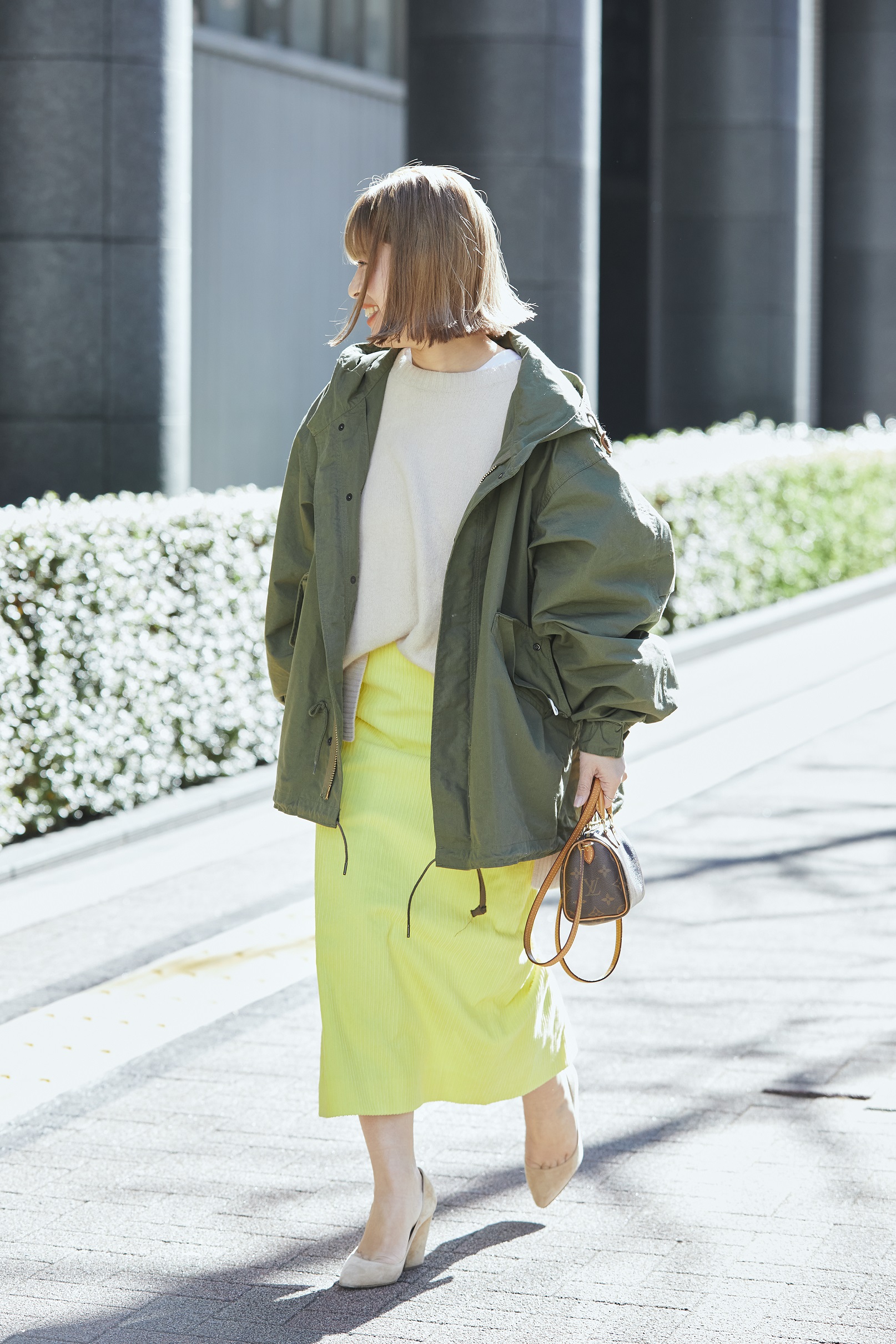 「普段はキレイめな着こなしが多いので、デニム×ニットは私のなかでは〝結構カジュアル〟な部類に入るのですが、ナノ・スピーディが入るととラフになりすぎないので助かっています。細かい話ですが、ミニバッグをななめ掛けにするときは、アウターの上からではなく、アウターの下に仕舞う派。大人っぽくまとまるのでおすすめです」