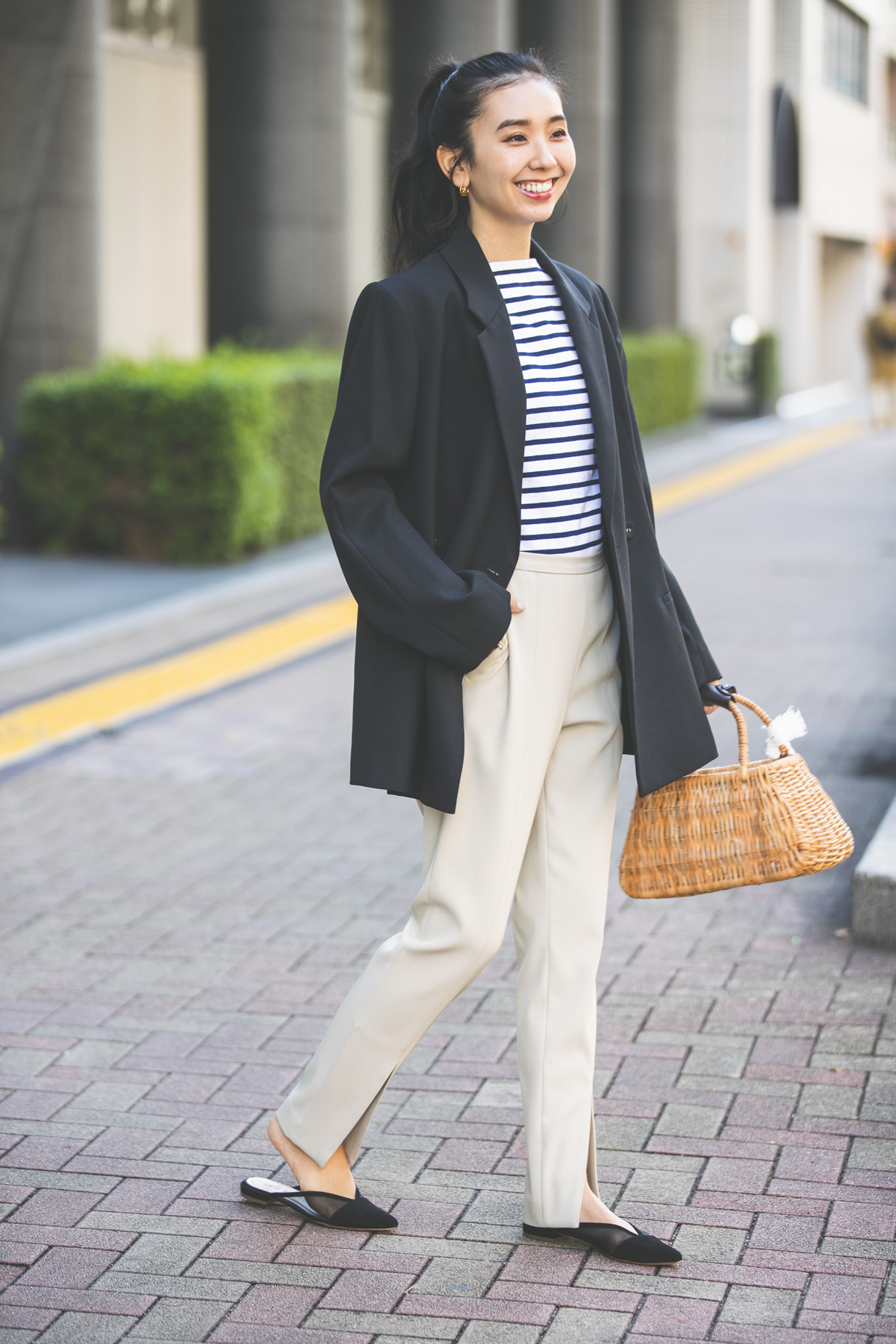 「ゆるっとしたジャケットにスリットパンツで、モノトーンだけどリラクシーな雰囲気に。カゴバッグとインナーにボーダーを入れることでちょっぴりパリジェンヌみたいなカジュアル感もプラスしました」(鈴木詩織さん IT関連勤務・30歳 162cm)