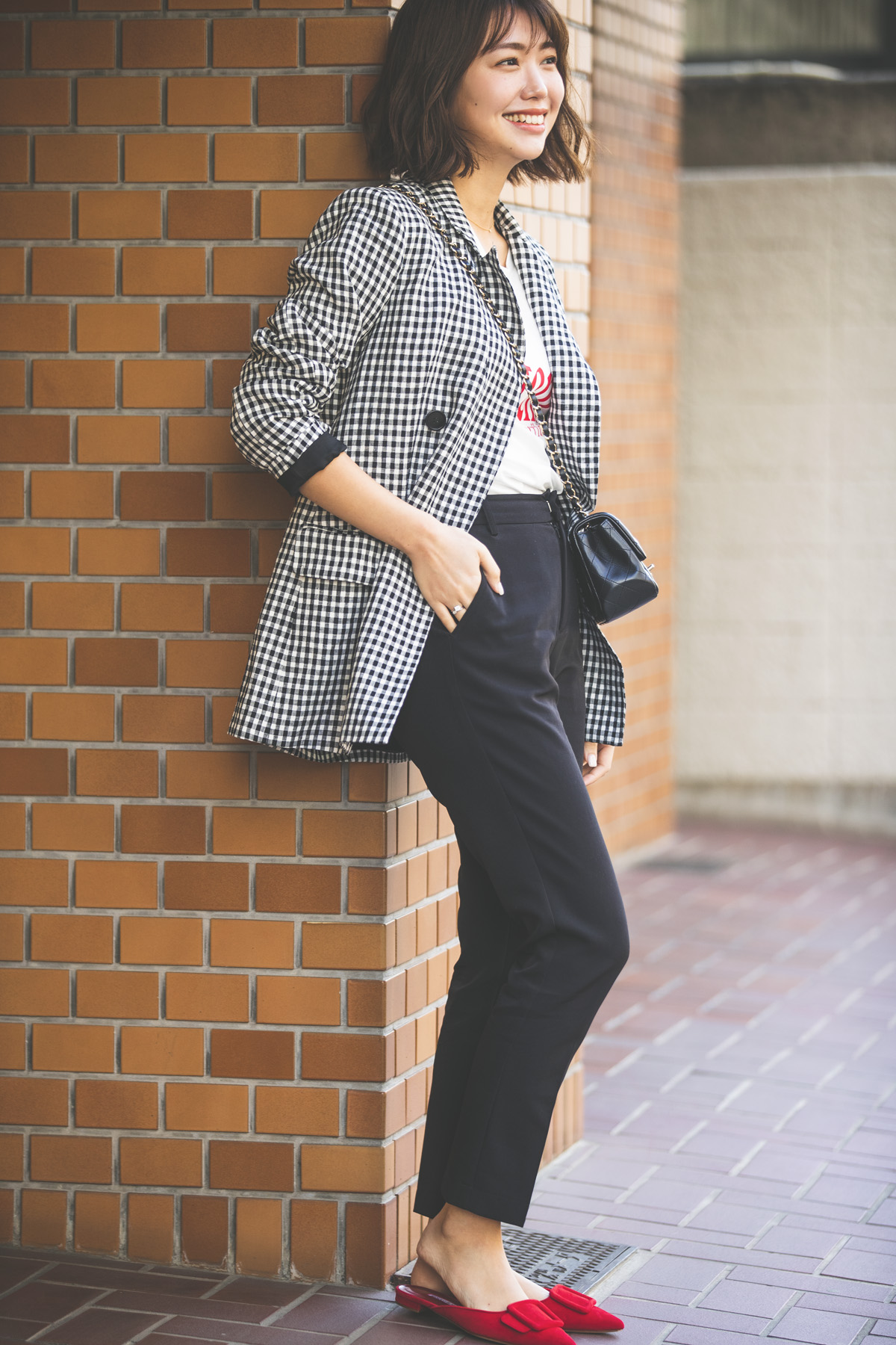 「普通っぽくなりがちなジャケット×パンツスタイルは、今季のトレンドでもあるチェック柄のジャケットとロゴTシャツ、そして赤いミュールで遊び心を取り入れました。バッグも斜めがけすることでラフな印象にすれば、休日も楽しめるジャケパンスタイルの完成です」(川森麻海さん アパレルPR・28歳 164cm)