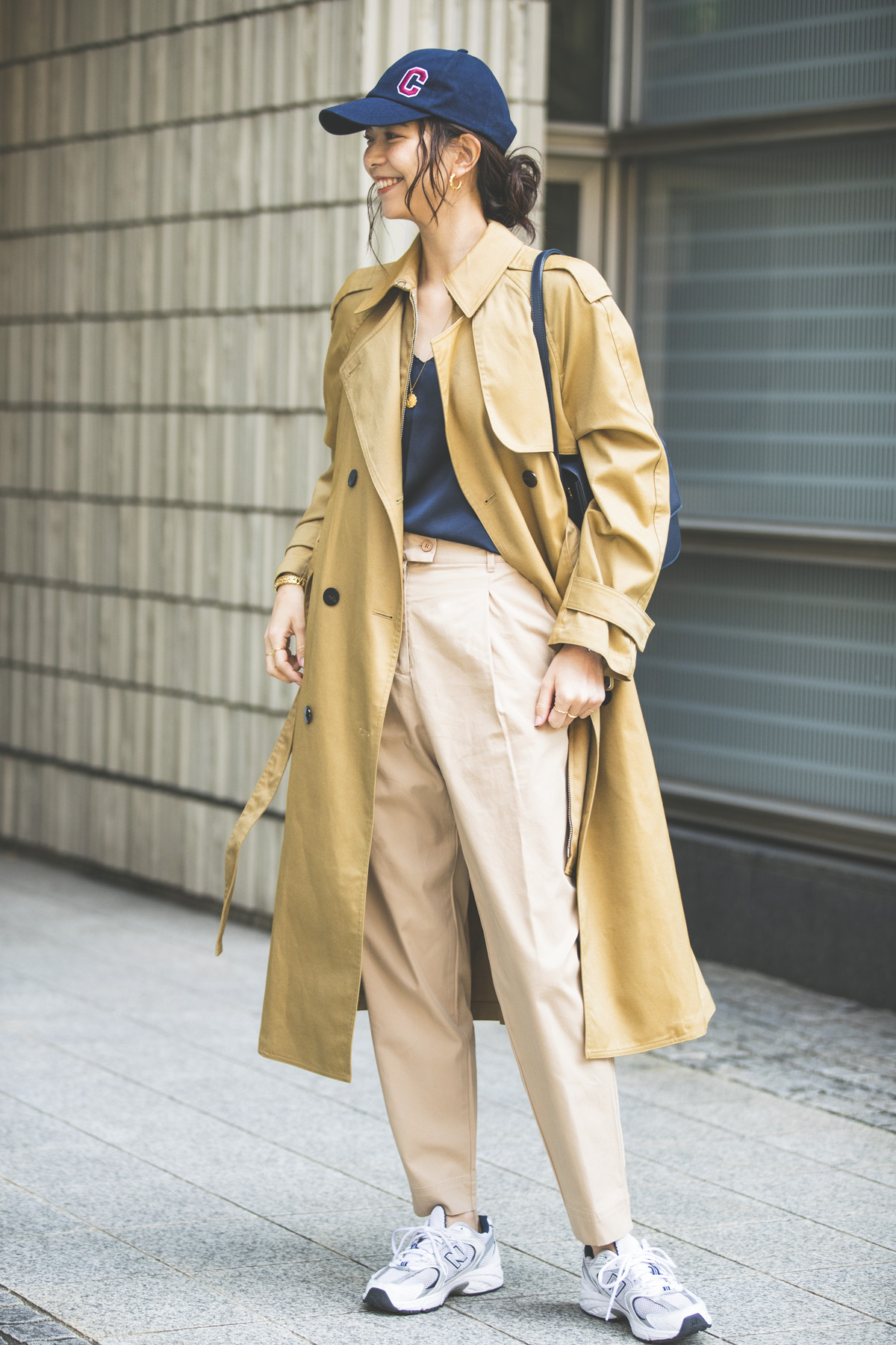 「ベージュ&ネイビーの私的に定番のツーカラースタイルは、チノパン・キャップ・スニーカーのメンズっぽいアイテムで仕上げました。その代わり深めVネックのトップスを合わせて、レディな雰囲気と抜け感を足しました」(佐藤 匠さん アパレル関係・30歳 173cm)