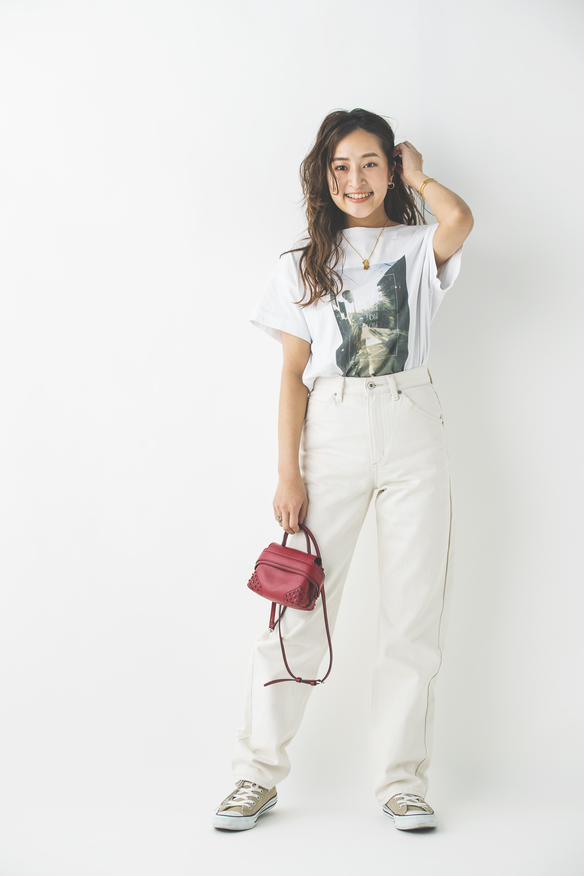「ユニクロのこの新作デニムは、白すぎずベージュ過ぎずの絶妙なカラーで、オールホワイトコーデも単調にならないのがお気に入り。シルエットも今年らしいから、フォトTシャツをインしたシンプルスタイルでもこなれて見えます。足元は大好きなコンバースのスニーカーでバッグは小ぶりのカラーバッグでリズムを加えました」(中村美貴さん IT関連勤務・27歳 160cm)