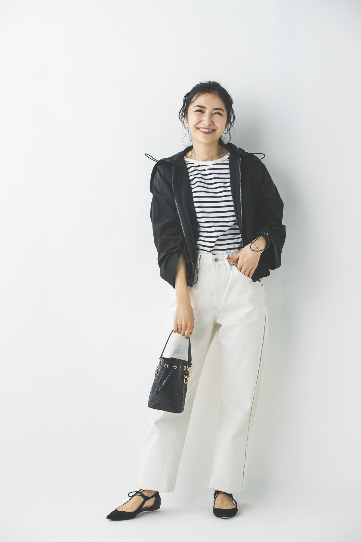 「エクリュデニムはブルーデニムほどラフにならずきれいめだから、思い切りカジュアルにマウンパとボーダーTシャツを合わせました。Sサイズなのでトップスインしたり、バランスを崩さない小ぶりのバッグを。さらに足元もフラットだけどとんがりトゥを選んでスタイルアップしながら、大人っぽいきれいめスタイルを目指しました」(桐 嵯梨さん 宝飾関係・29歳 156cm)