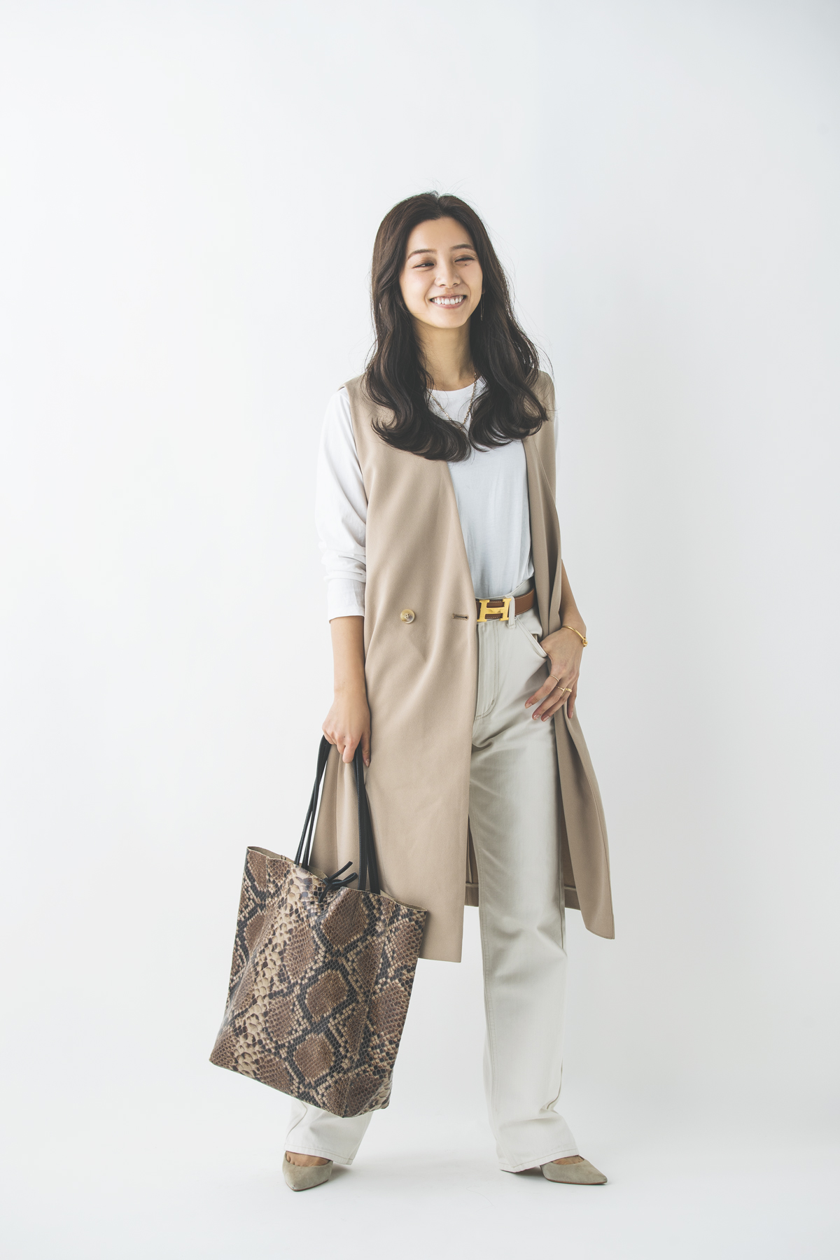 「オフィスにも着ていけるきれいめデザインのデニムだから、ロングTシャツ×ベージュのジレを重ねて旬のレイヤードスタイルに。地味に見えないようにパイソン柄のバッグでアクセント加えました」(松田衣里菜さん 商社勤務・31歳161cm)
