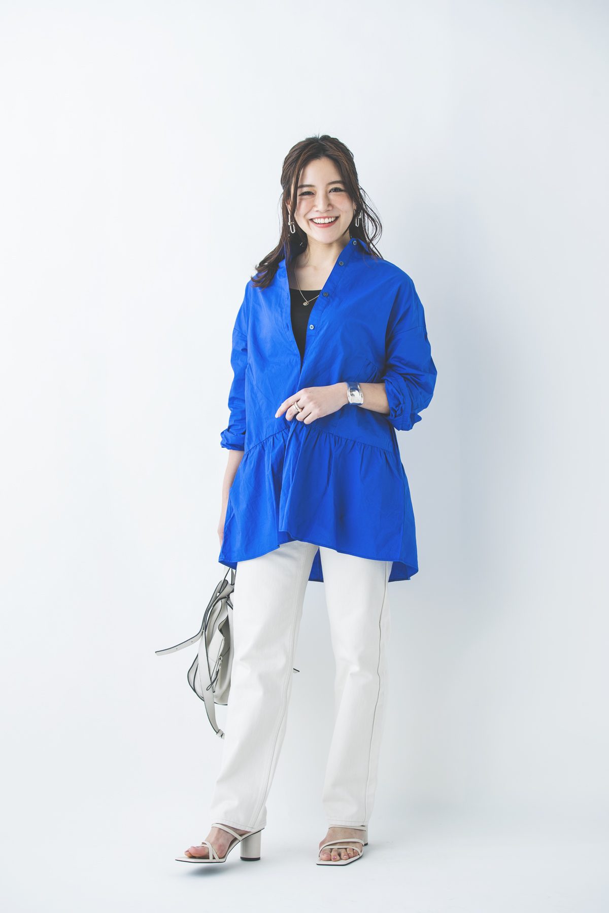 「このデニムはパキッとした白じゃないのとステッチがポイントになって、カジュアル感があるからきれいめのカラーブラウスと合わせてもコンサバになり過ぎないのが嬉しい。バッグやサンダルはホワイトでまとめて引き算をしたのがポイントです」(石井里奈さん 通信関連勤務・31歳 165cm)