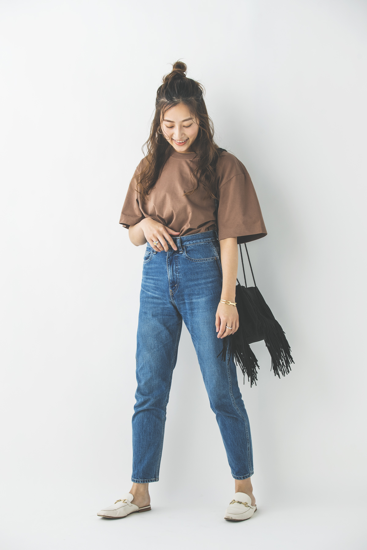 「Tシャツのシルエットや少しハリのある光沢感がトレンドど真ん中のデザインだから、同じくトレンドのハイウエストデニムと合わせるだけで、旬なスタイルになれるのがお気に入り。バッグはニュアンスと辛口なムードを楽しめる黒のフリンジバッグを合わせました」 (中村美貴さん IT関連勤務・27歳 160cm)