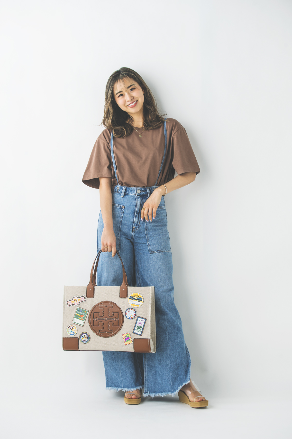 「シンプルな無地Tシャツだけど、上品カラーとフレア気味の袖で上品に着られるから思いきりラフなデニムでハズしました。バッグもワッペンデザインがキャッチーなトリーバーチ、足元もクリアサンダルでちょっぴり遊んだ休日コーデに仕上げました」(藤田梨沙さん パーソナルトレーナー・25歳 160cm)