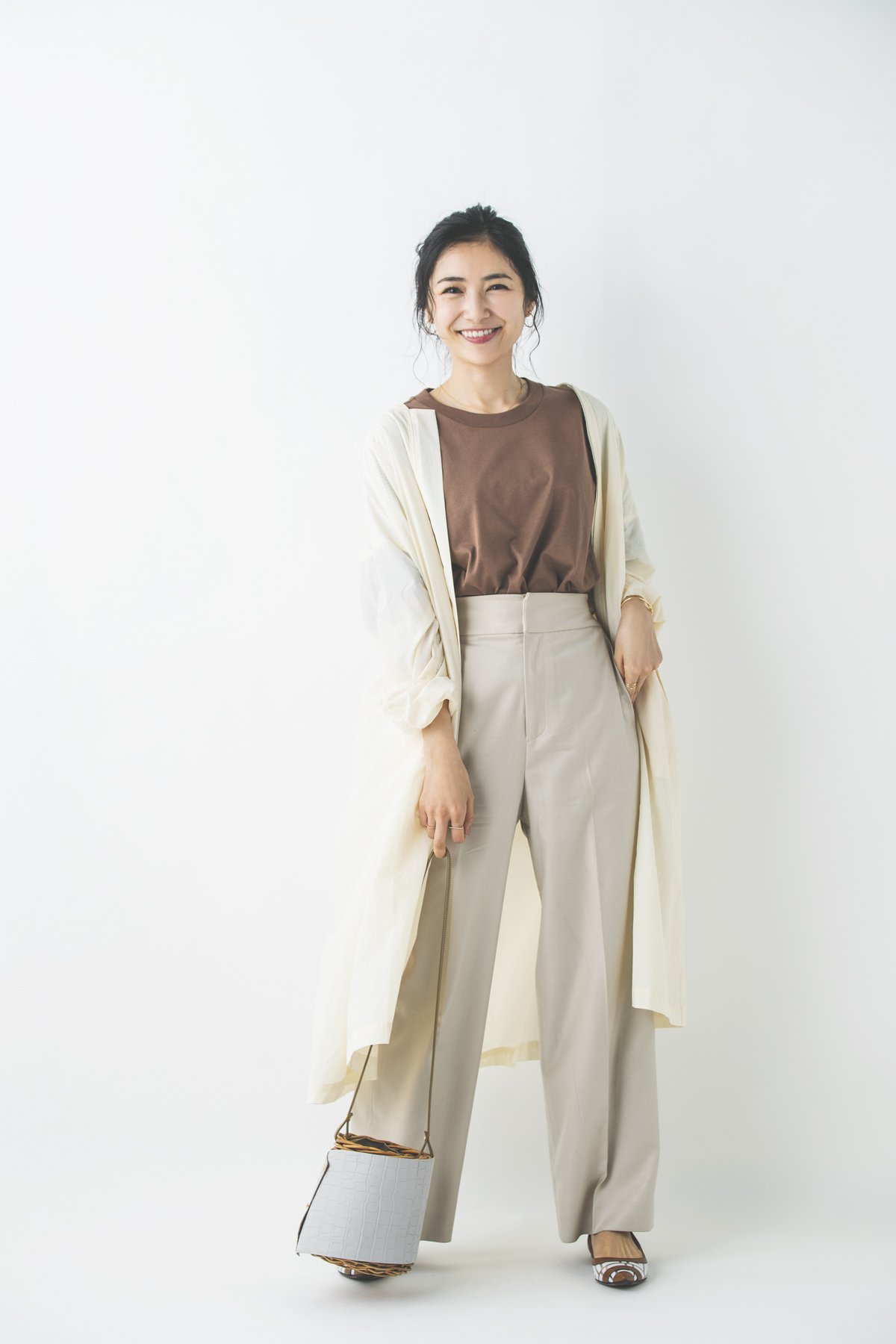 「Tシャツのきれいなブラウンを生かして、ホワイトのロングアウターとセンタープレスパンツで、きれいめなコーディネートに。インナーとコントラストをつけつつ、ハイウエストパンツとロングアウターを合わせるのは私のお気に入りのスタイルアップ術なんです。コンサバにならないようにカゴバッグを合わせたり、パンプスもスクエアトゥや柄にデザイン性があるものを選んでいます」(桐 嵯梨さん 宝飾関係・29歳 156cm)