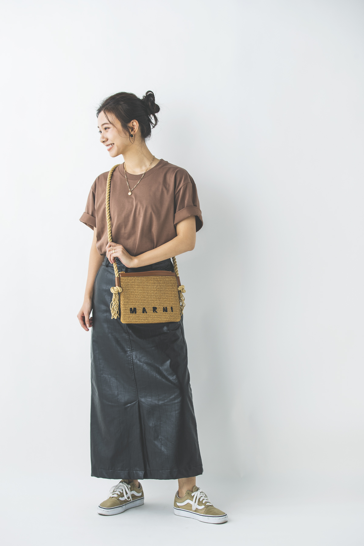「きれいなブラウンと色味を合わせて、フェイクレザースカートで休日にぴったりなコーディネートに。シンプルなので袖をひと折りしたり、ボトムスインしたり、ゴールドのコインネックレスを合わせたり、ひと手間かけることでオシャレ感を演出。仕上げにロゴ入りのラフィアバッグでアクセントを加えました」(松田衣里菜さん 商社勤務・31歳161cm)