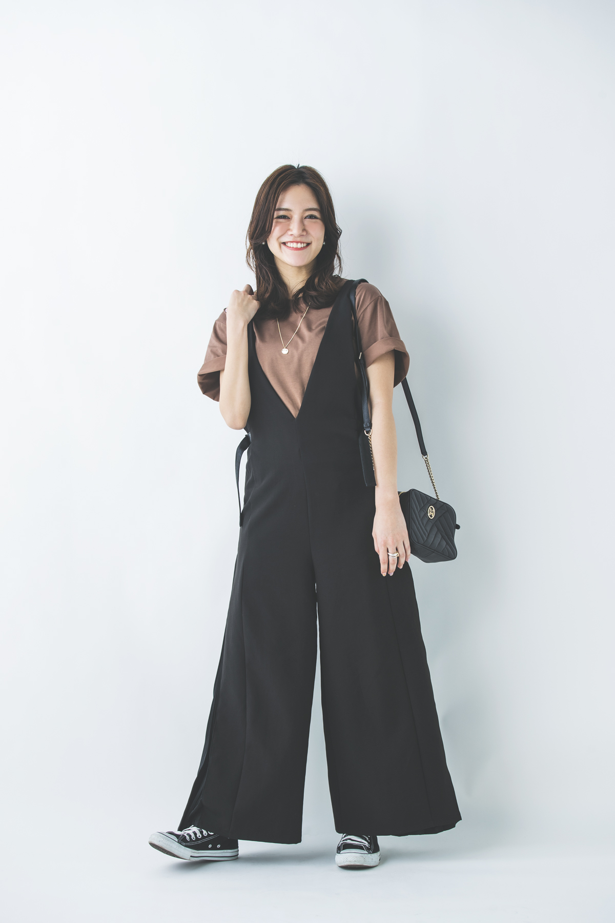 「黒のロンパースとスニーカーでちょっと辛口なカジュアルスタイルに。Tシャツの袖をひと折りしてこなれ感をアップさせたのがポイント。白Tよりも大人っぽく着られる色合いや高見えする生地感がお気に入りで、コンサバ派な私にも着ややすかったです!」 (石井里奈さん 通信関連勤務・31歳 165cm)