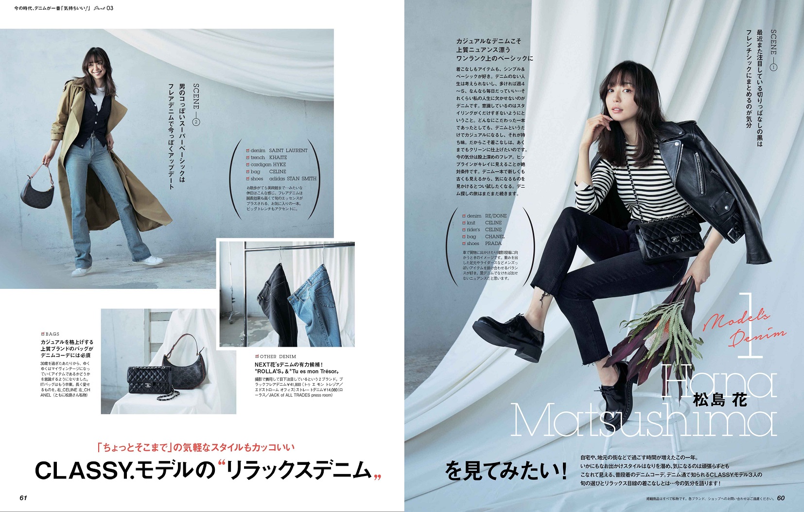 モデルさんの普段着って、やっぱりオシャレでカッコいいんです。頑張ってない風で、こなれ感たっぷりで…「ちょっとそこまで」な着こなしで無造作なはずなのに、すごく素敵なんです。ということで、この企画ではCLASSY.モデルの中でも“デニム通”として知られる松島 花ちゃん、有末麻祐子ちゃん、堀田 茜ちゃんの普段着デニムスタイルを大公開!