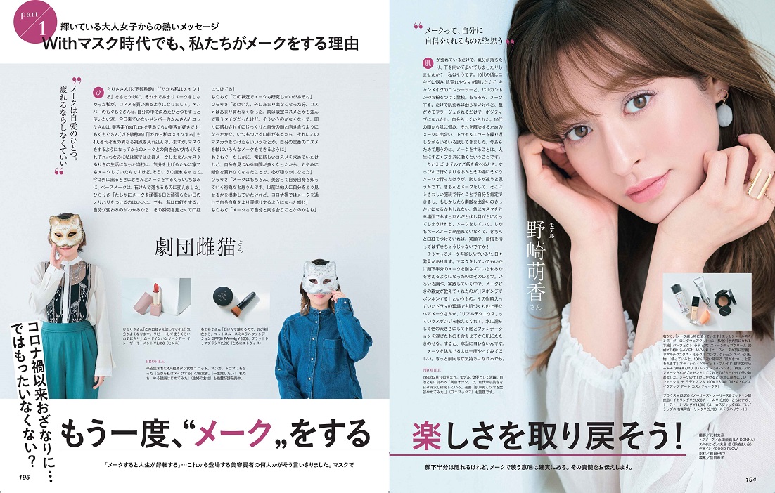 「どうせマスクで隠れるから」と、しばらくメークをサボって来たけれど、こんなことでいいのだろうか?とモヤモヤしているそこのあなた。そんなことではいけません! コロナのせいで、マスクのせいで、“メークをする楽しさ”を放棄しているなんて、どう考えてももったいない!…そんな熱い思いに動かされて全力取材した特集、ぜひ読んでいただきたいです!