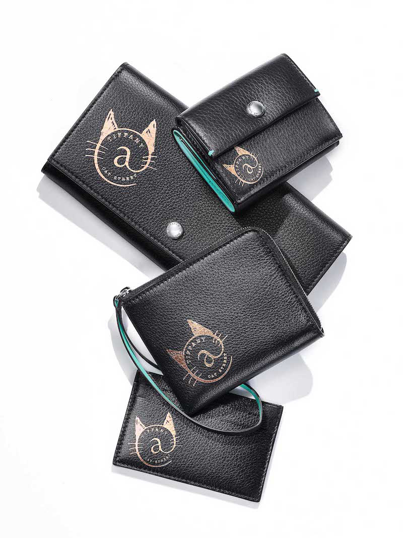 今回登場するのは、ストアのシグネチャーであるキャットモチーフが施された4型のレザーグッズ。長財布、コンパクトウォレット、コインポーチ、そしてカードケースが、装いも新たにシックなブラックに。ウォレットやストラップの内側からちらりと覗くティファニーブルーが映える、大人のデザインに仕上がりました。