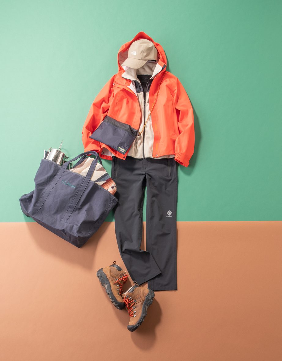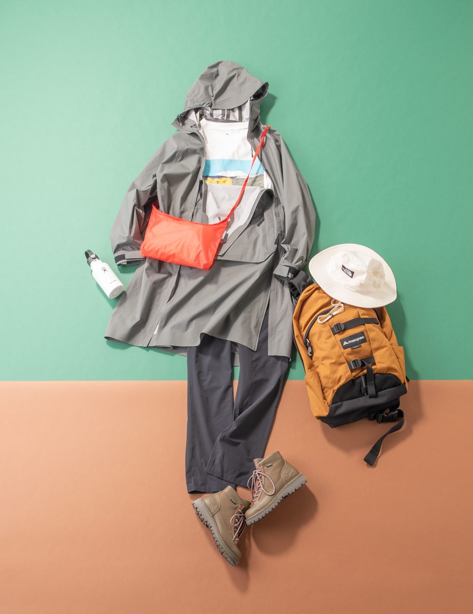 おしりまでしっかり隠れる丈のレインポンチョが山で大活躍。2WAYジップやたっぷり収納できるポケットも便利です。防水透湿性のあるゴアテックス&グリップ力の高いビブラムソールのシューズや、UVカットの帽子、耐水バックパックなど、小物まで抜かりなく装備すれば完璧 ! ポンチョ¥44,000カットソー¥6,380(ともにスノーピーク)パンツ¥9,900(マーモット/デサントジャパンお客様相談室)ショルダーバッグ¥1,870(モンベル/モンベル・カスタマー・サービス)バッグパック¥17,600<マックパック>帽子¥5,170<ザ・ノース・フェイス>(ともにゴールドウイン カスタマーサービスセンター)トレッキングシューズ¥31,680(スノーピーク×ダナー/スノーピーク)ボトル¥4,400(ザ・ノース・フェイス/ザ・ノース・フェイス 3(マーチ))