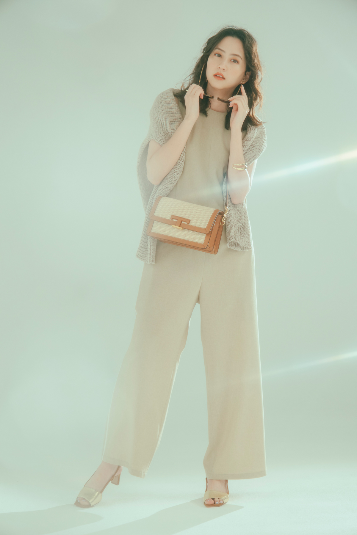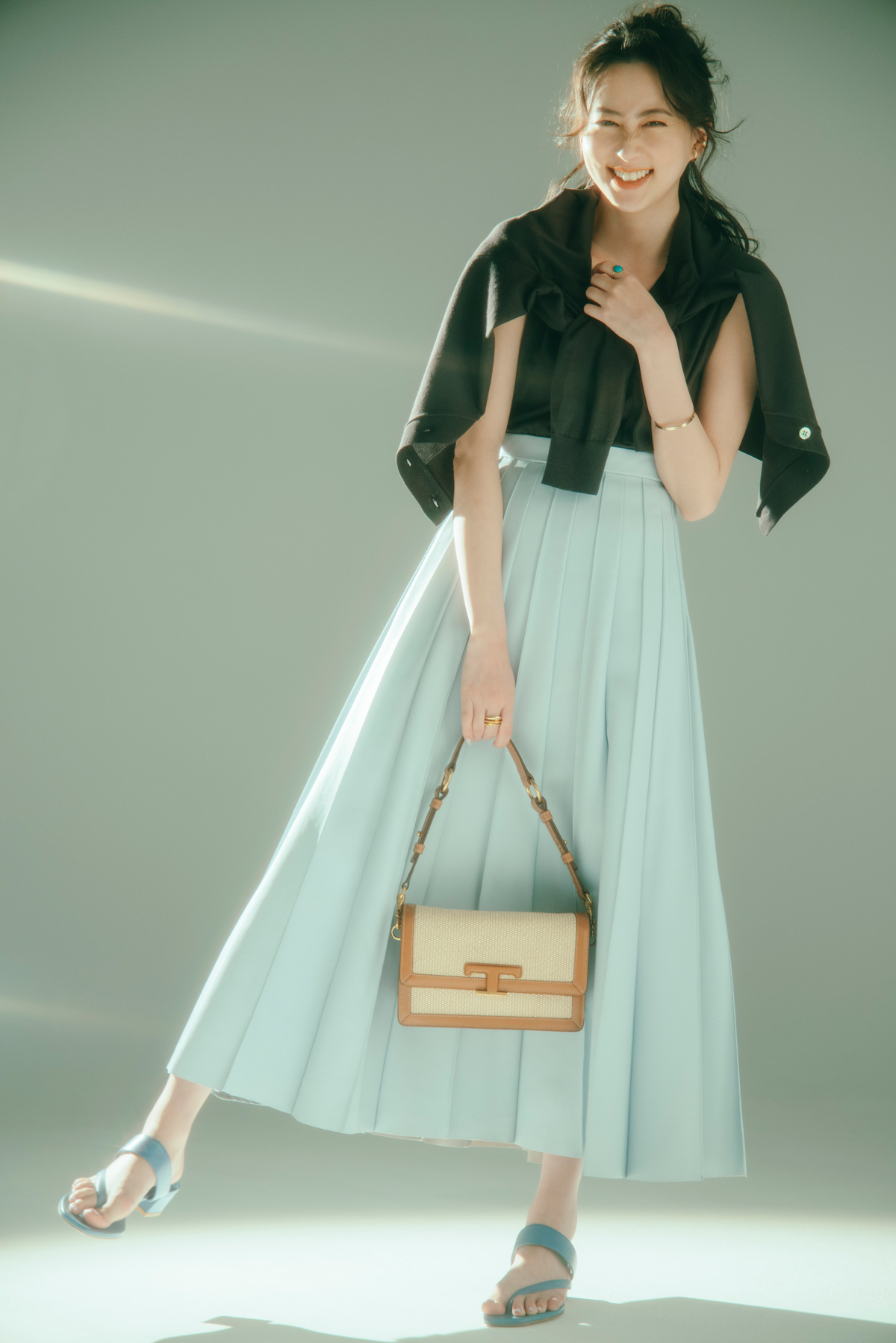 ニットのアンサンブル×プリーツスカートの王道コンサバにこそ、夏らしいナチュラル素材のバッグをON。バッグの持つ爽やかで軽やかなムードで、キレイにまとまりがちなコンサバコーデも今っぽくヘルシーにシフト。ブランドのアイコンである「T タイムレス」モチーフがシンプルコーデのアクセントに。