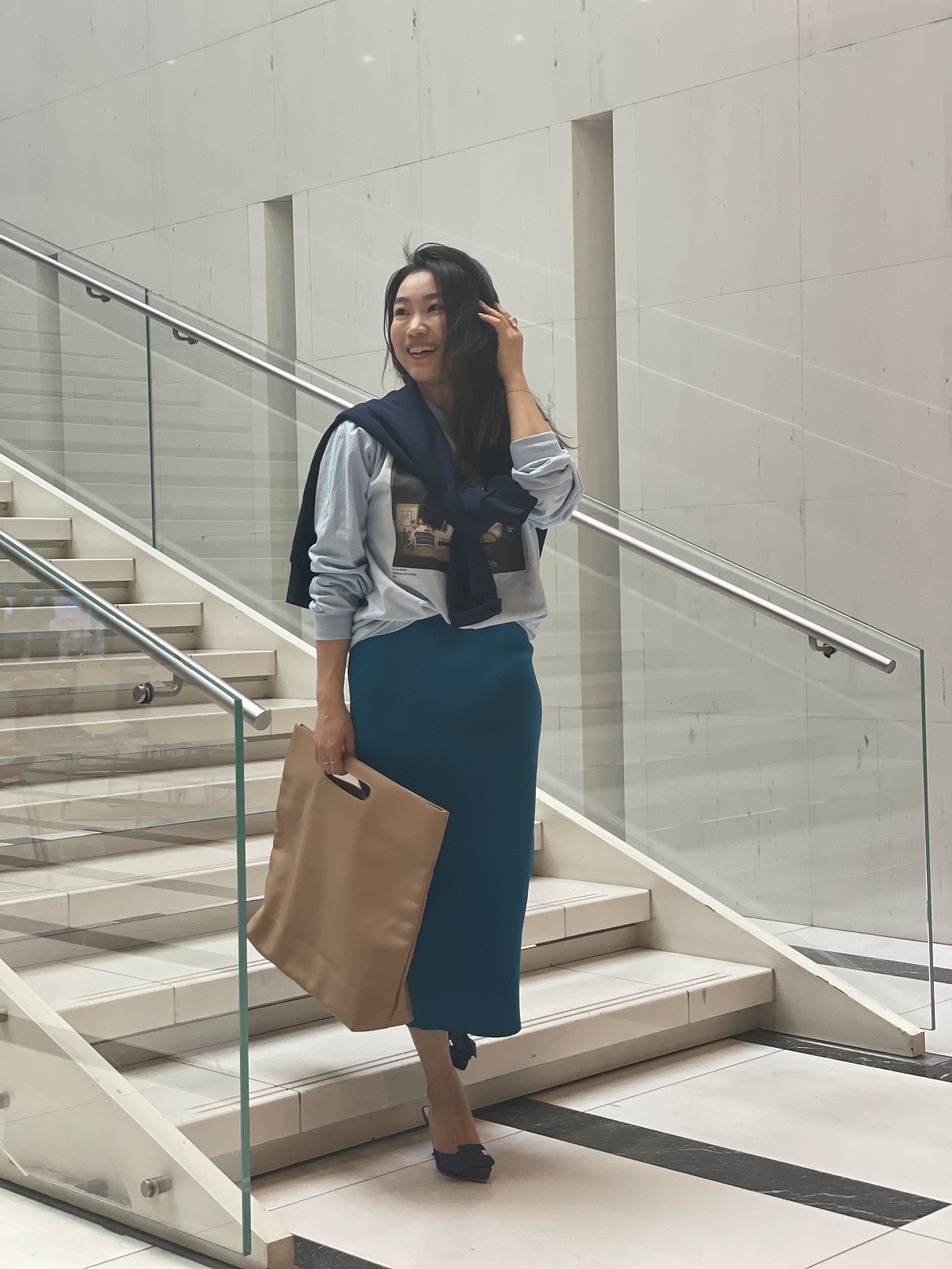 トレンドのフォトTシャツにニットタイトスカートを合わせて、ベージュのレザークラッチと相性のいいブルーのワントーンスタイルに。足元はデニム地のミュールでアクセントを加えました。