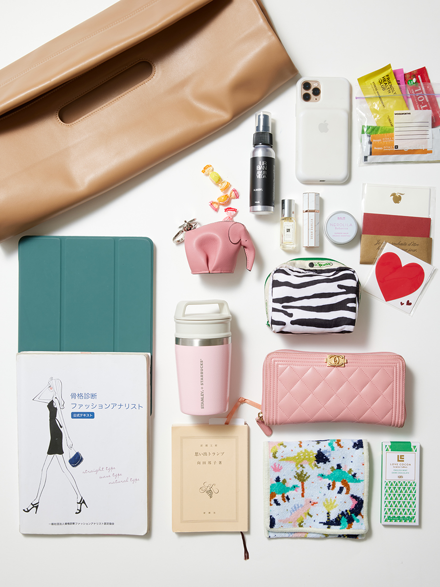 ライターなのでガジェット類や資料など、基本的に荷物は多め。だからバッグも軽くて大容量なバッグを選びがちです。大好きな桜ピンクの小物をベースに毎シーズンその時の気分の色やモチーフの小物を取り入れることが多いですね。それに占いから美容、トレンドのお菓子、韓流コスメまで…幅広〜くミーハーな私ならではの大好きが詰まったバッグの中身です。