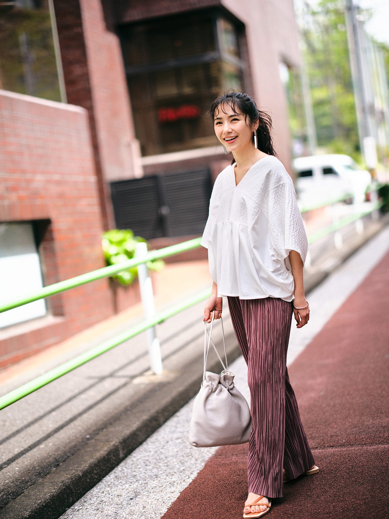 2wayトップス¥9,350プリーツパンツ¥9,790(ともにAKTE)バッグ¥20,350(ADINA MUSE/ADINA MUSE ルミネ新宿店)サンダル¥7,590(RANDA)ピアス¥5,940バングル¥7,350(ともにアビステ)
