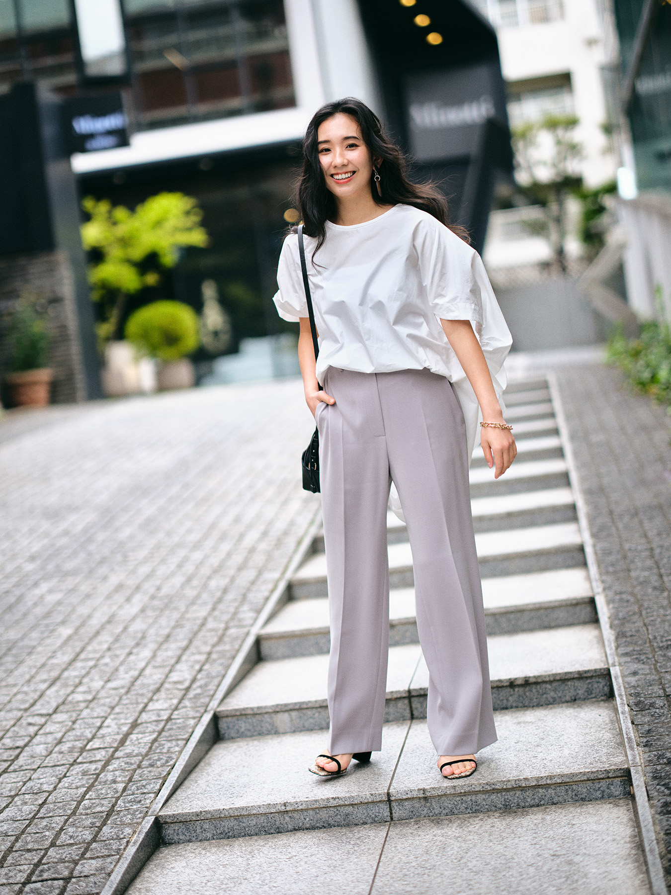ブラウスが個性的だから、ベーシックなパンツを合わせるだけで洗練された印象に。