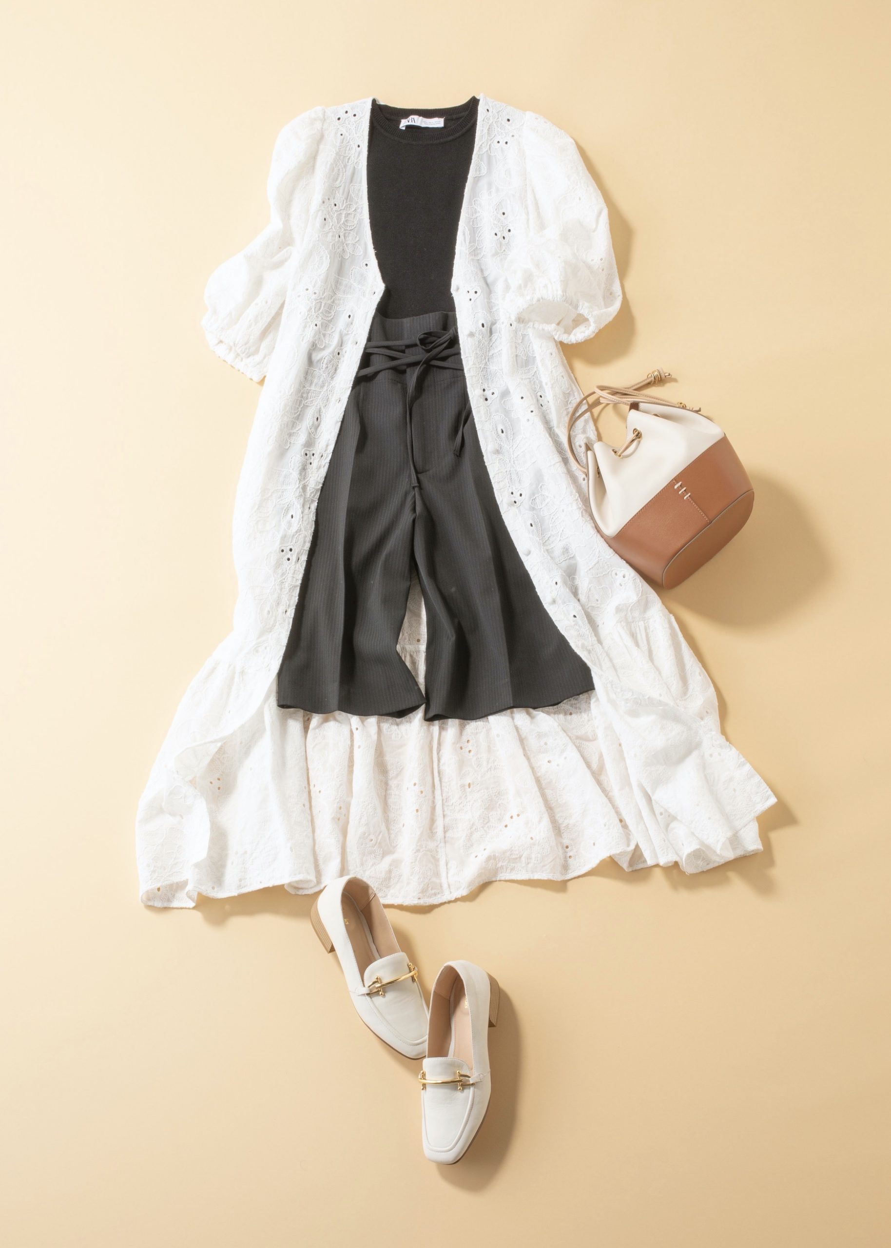 刺繍ワンピース¥6,990ノースリーブニット¥1,990ハーフパンツ¥6,990(すべてザラ/ザラ・ジャパン)バッグ¥8,690(カカトゥ/アンビリオン)ローファー¥24,200(クラークス/クラークスジャパン)