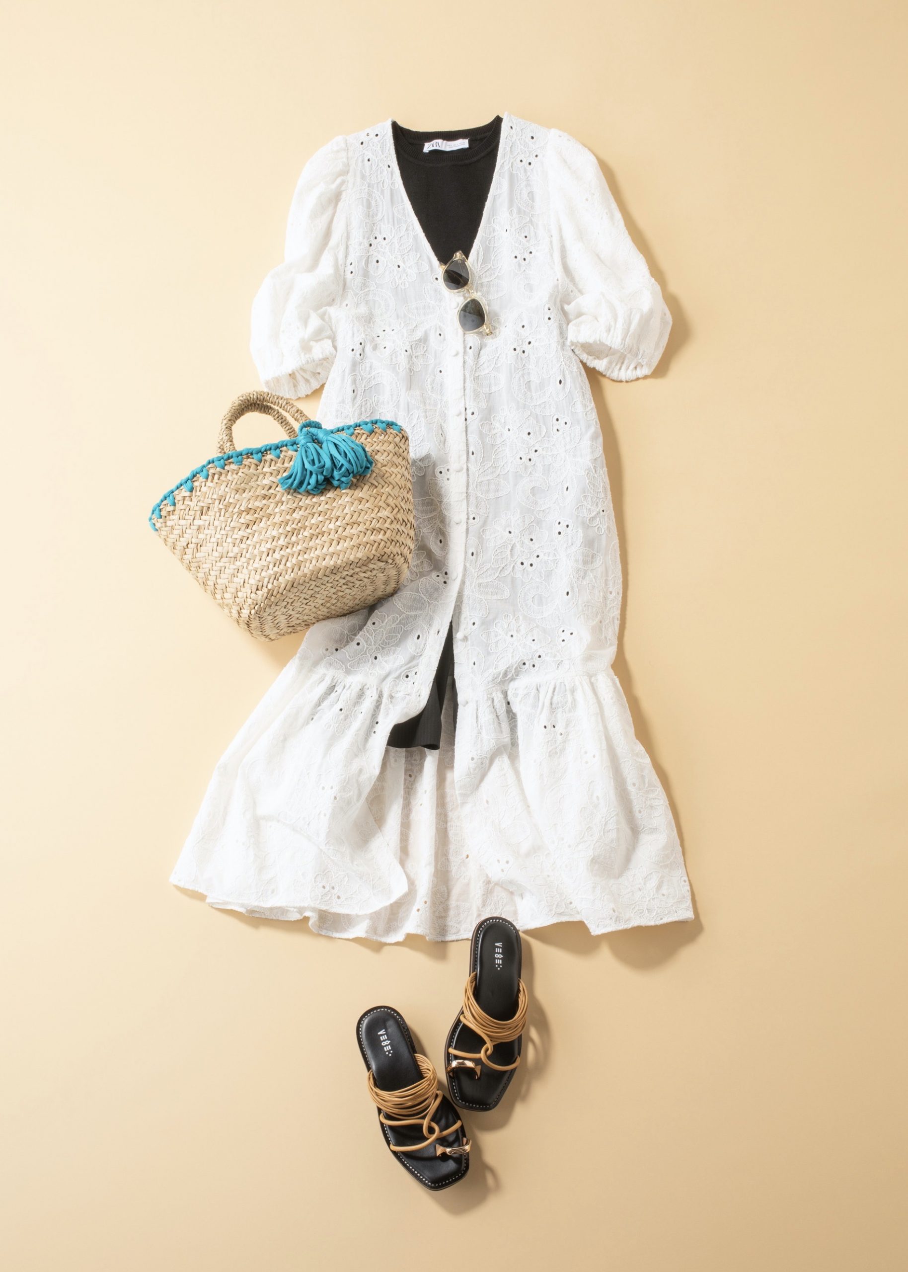 刺繍ワンピース¥6,990ノースリーブニット¥1,990ハーフパンツ¥6,990(すべてザラ/ザラ・ジャパン)カゴバッグ¥6,490(カシュカシュ/アンビリオン)サンダル¥16,500(VEGE)サングラス¥35,200(アイヴァン/アイヴァン 東京ギャラリー)