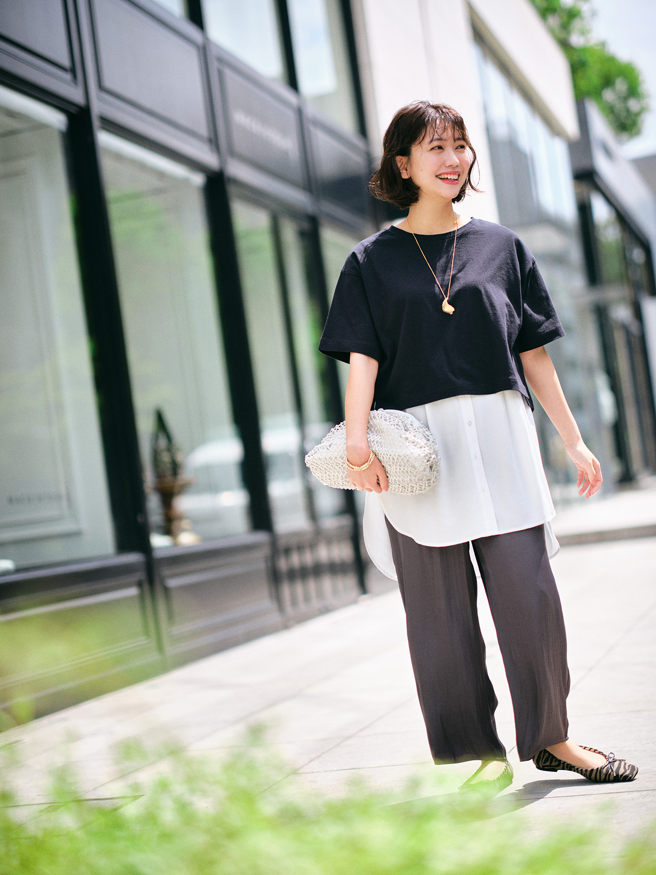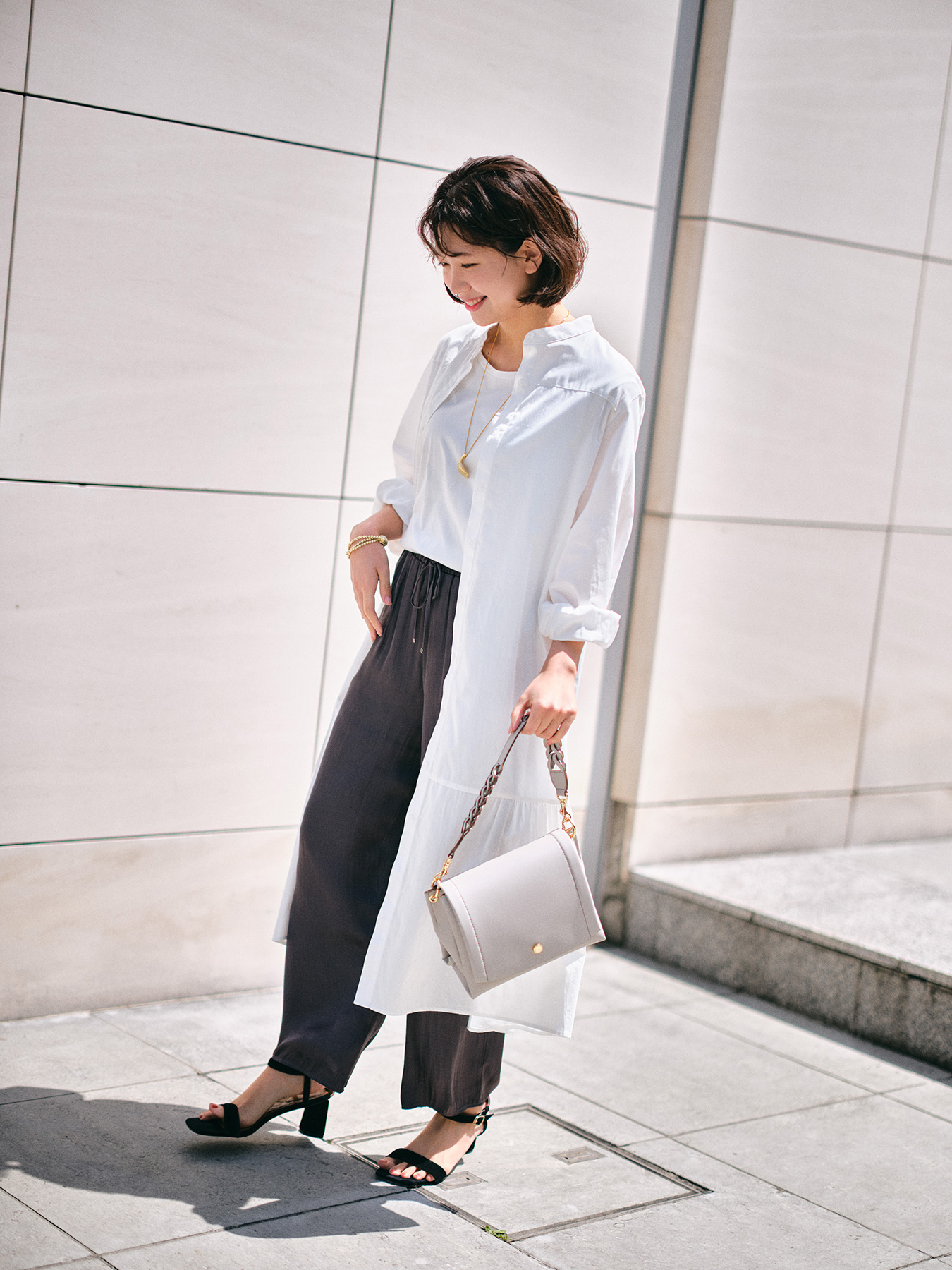 シャツワンピース¥6,050ノースリーブカットソー¥1,650サテンパンツ¥4,950(すべてグローバルワーク/アダストリア)バッグ¥30,800(サマンサタバサ/サマンサタバサ ルミネ新宿店)サンダル¥31,900(ダブルスタンダードクロージング/フィルム)ネックレス¥9,900(イン ムード/フォーティーン ショールーム)ブレスレット¥5,400(アビステ)