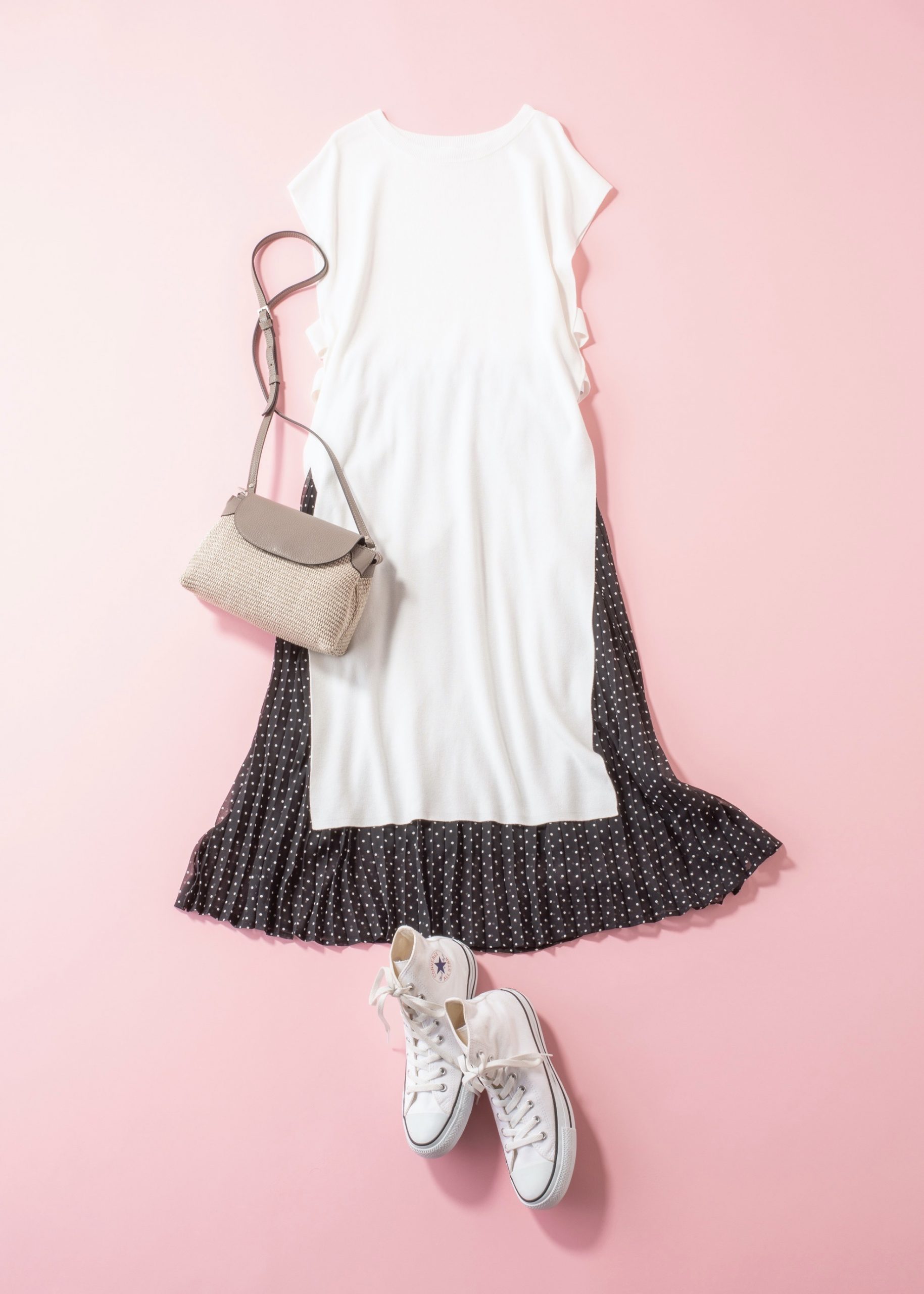ロングニットベスト¥2,490ドットプリーツスカート¥1,990(ともにGU)バッグ¥25,300(RIPANI/S.I.M)スニーカー¥7,150(コンバース/コンバースインフォメーションセンター)