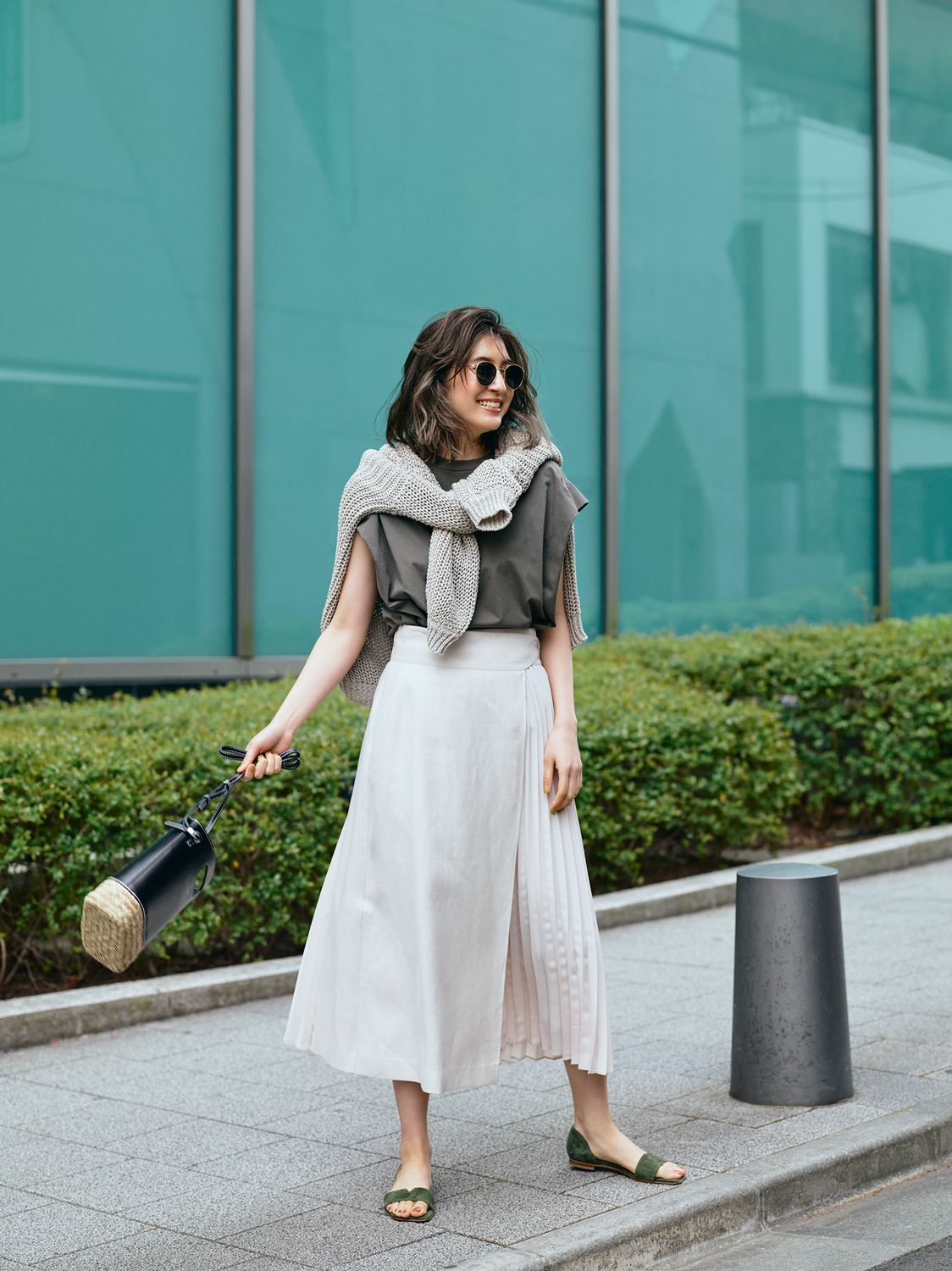 Tシャツ¥15,400(サクラ/インターリブ)肩掛けニットカーディガン¥20,900(ルーニィ)スカート¥15,400(アンクレイヴ)バッグ¥19,580(ヤーキ/ショールーム セッション)カーキサンダル¥48,400(ネブローニ/フラッパーズ)サングラス¥39,600(アイヴァン/アイヴァン 東京ギャラリー)ピアス¥15,950(ソコ/ZUTTOHOLIC)